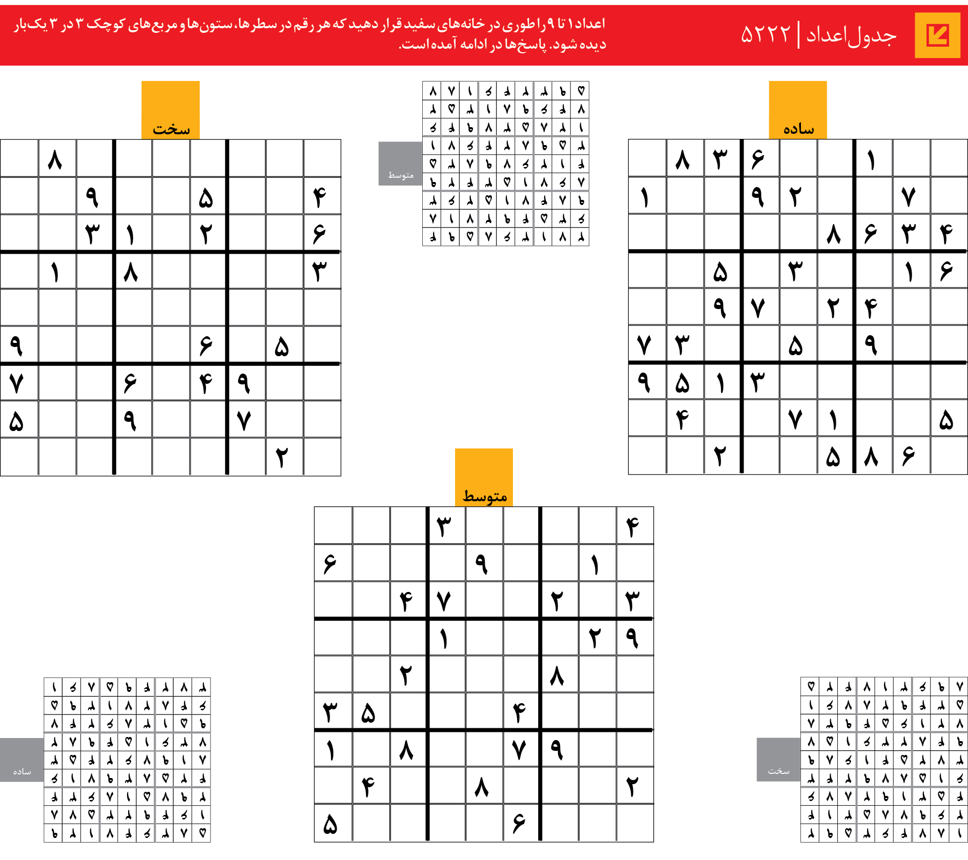 اعداد 1 تا 9 را طوری در خانههای سفید قرار دهید که هر رقم در سطرها، ستونها و مربعهای کوچک 3 در 3 یکبار دیده شود. پاسخها در ادامه آمده است.