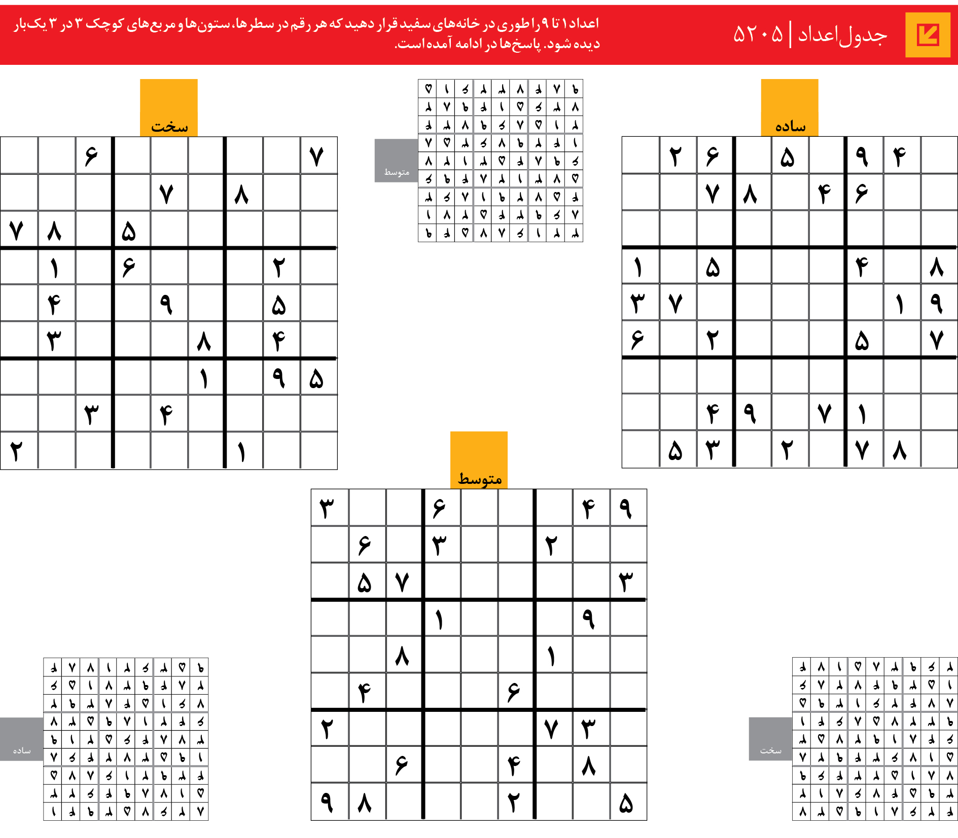اعداد 1 تا 9 را طوری در خانه‌های سفید قرار دهید که هر رقم در سطرها، ستون‌ها و مربع‌های کوچک 3 در 3 یک‌بار دیده شود. پاسخ‌ها در ادامه آمده است.