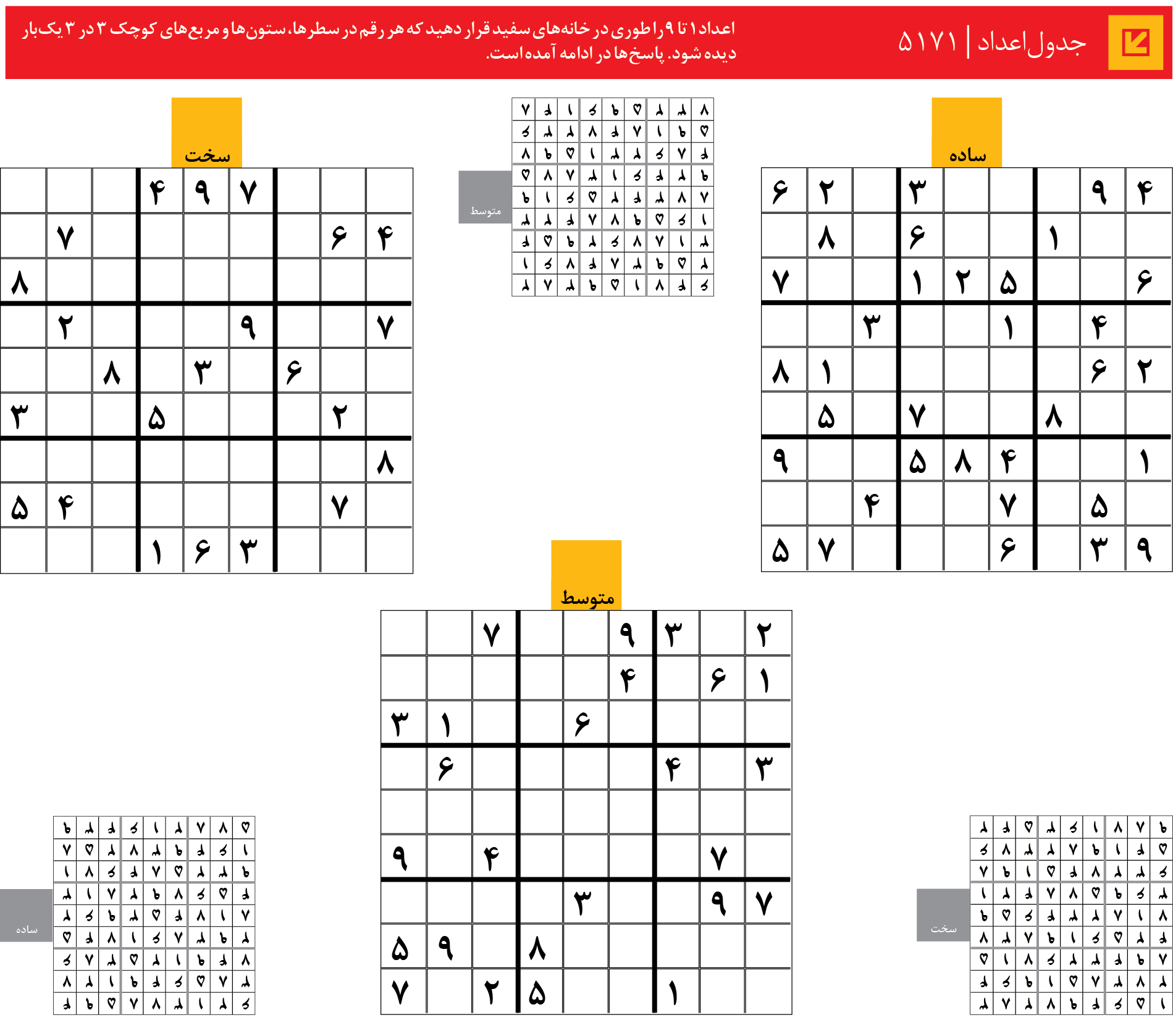 اعداد 1 تا 9 را طوری در خانههای سفید قرار دهید که هر رقم در سطرها، ستونها و مربعهای کوچک 3 در 3 یکبار دیده شود. پاسخها در ادامه آمده است.