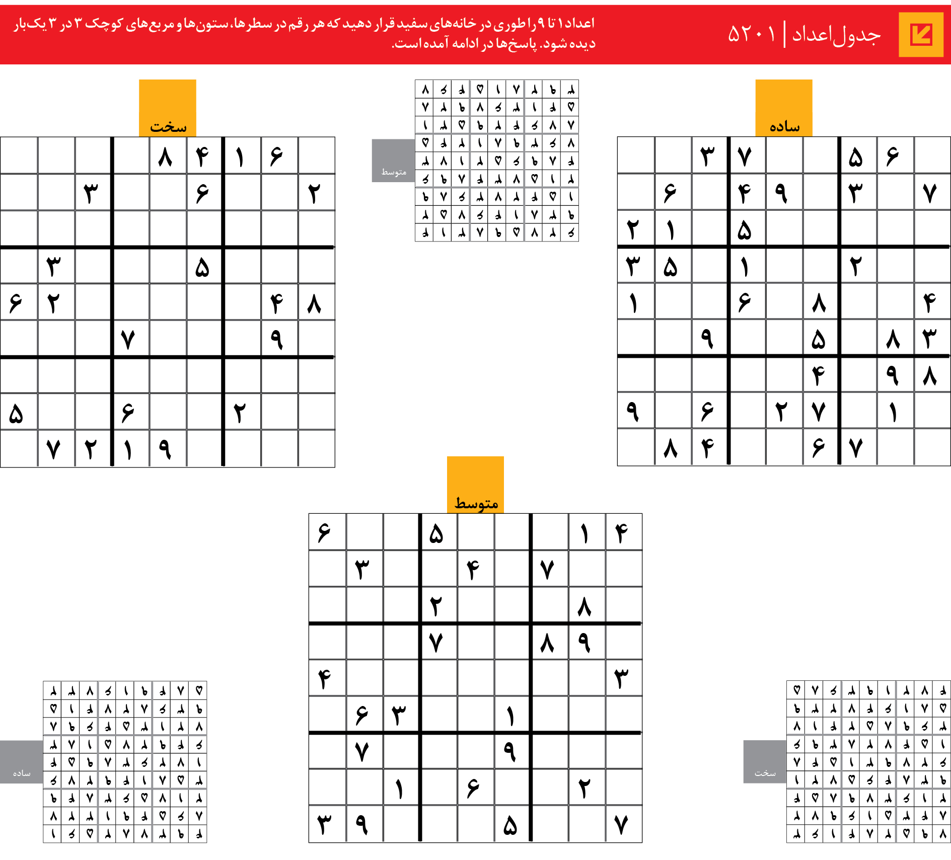 اعداد 1 تا 9 را طوری در خانههای سفید قرار دهید که هر رقم در سطرها، ستونها و مربعهای کوچک 3 در 3 یکبار دیده شود. پاسخها در ادامه آمده است.