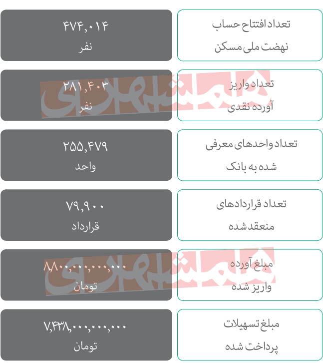 آمارهای مربوط به آخرین وضعیت تأمین مالی پروژه‌های نهضت ملی مسکن، از پایین بودن مشارکت متقاضیان نسبت به بزرگی این نهضت حکایت دارد. طبق قانون، بانک‌ها در سال نخست باید حدود 360 هزار میلیارد تومان تسهیلات به این طرح اختصاص می‌دادند اما آن‌گونه که محمود شایان، مدیرعامل بانک مسکن می‌گوید تاکنون فقط 7 هزار و 438 میلیارد تومان از این تسهیلات به سازندگان نهضت ملی مسکن پرداخت شده است.