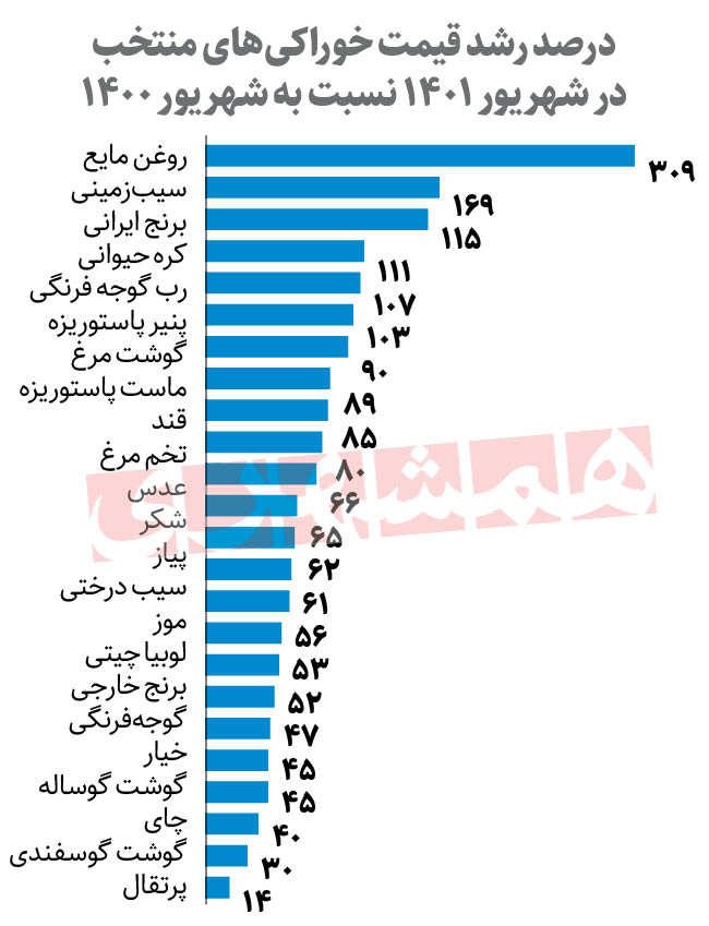 مرکز آمار ایران میگوید: نرخ تورم نقطه به نقطه کالاهای خوراکی و آشامیدنی در شهریور امسال نسبت به شهریور پارسال بهطور میانگین 76درصد رشد داشته است. البته این نهاد تاکنون جزئیات تغییر قیمت بیش از 50 قلم کالاهای خوراکی را که هرماه منتشر میکرد، این بار منتشر نکرده است. اما در گزارش جداگانهای از تغییرات رشد قیمت 24قلم کالاهای خوراکی منتخب رونمایی کرده که نشان میدهد روغن مایع 309درصد، سیب زمینی 169درصد، برنج ایرانی 161درصد، کره حیوانی 115درصد، پنیر پاستوریزه 107درصد و گوشت مرغ 103درصد افزایش قیمت را در فاصله شهریور1400 تا شهریور 1401تجربه کرده است. این گزارش از افزایش 90درصدی قیمت ماست پاستوریزه حکایت دارد. بهگفته مرکز آمار رشد قیمت شیر پاستوریزه، قند و تخم مرغ بالای 80درصد، سیب درختی زرد، پیاز، شکر و عدس بالای 60درصد، موز، لوبیا چیتی و برنج خارجی بالای 50درصد بوده و گوشت گوساله و چای بالای 40درصد و گوشت گوسفندی هم 30درصد گرانتر شده و تنها پرتقال تولید داخل بوده که 14درصد افزایش قیمت داشته است.