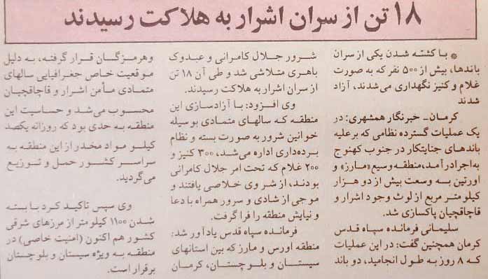 درگیری مسلحانه بین اشرار مسلح و نیروهای مرزبانی در سیستان و بلوچستان به شهادت 2نفر از مرزبانان منجر شد. چهارشنبه شب اشرار مسلح قصد داشتند از 2منطقه زابل و زاهدان محمولههای موادمخدر را به کشور قاچاق کنند اما مرزبانان با آنها درگیر شدند. سردار قاسم رضایی، فرمانده مرزبانی ناجا به پایگاه خبری پلیس گفت: قاچاقچیان قصد داشتند همزمان از زابل و زاهدان وارد کشور شوند که مرزبانان مقابل آنها ایستادگی کردند. در این 2 عملیات حدود 1100 کیلو انواع مواد مخدرکشف شد و2نفر از مرزبانان به نامهای استواریکم محسن شهرکی و سرباز وظیفه جلال بهبودی زابلی به شهادت رسیدند.