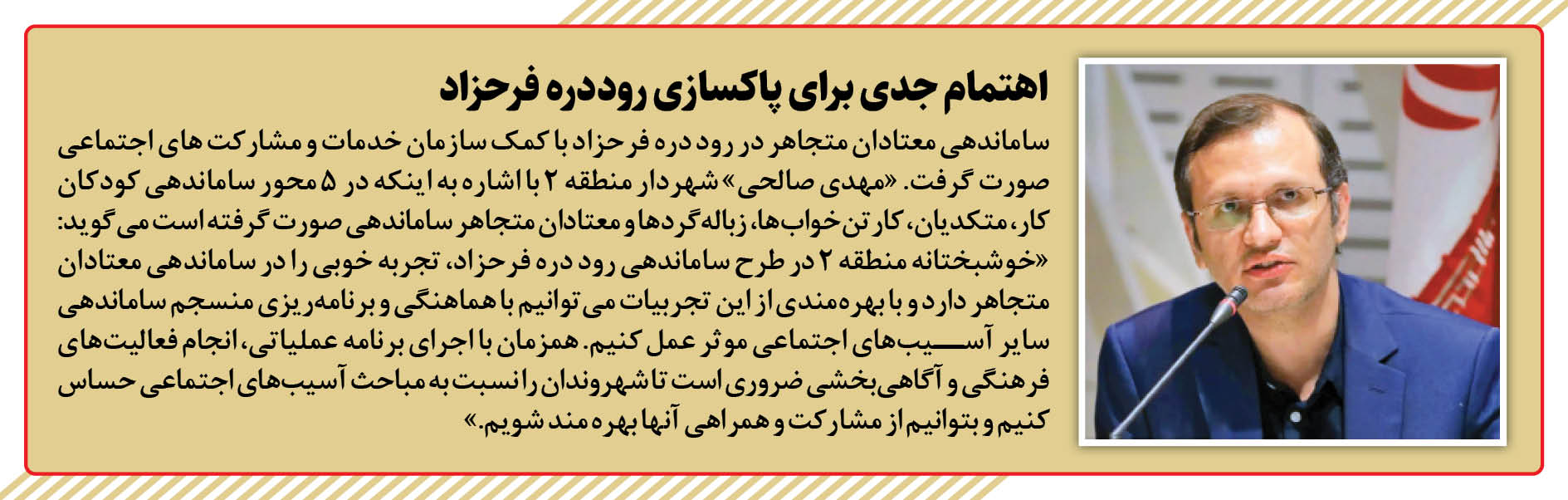 معاون شهردار تهران با بیان اینکه در مجموع بیش از ۷ هزار نفر در طرح پانزده روزه ساماندهی آسیبهای اجتماعی پایتخت ساماندهی شدند، میگوید: «بعد از دو سال تلاش شبانهروزی برای ایجاد زیرساخت ها و بسترهای مناسب ساماندهی آسیبهای اجتماعی تهران، به وضعیت مناسبی در این حوزه رسیدهایم. چالشها و موانع پیش روی کاهش آسیبهای اجتماعی برطرف شد و شاهد وضعیت مناسبی در این حوزه هستیم که انشاالله با مساعدت شهروندان عزیز تهرانی در محلههای تهران، آماراین دسته از آسیبهای اجتماعی در آینده نیز روند نزولی پیدا خواهد کرد.»