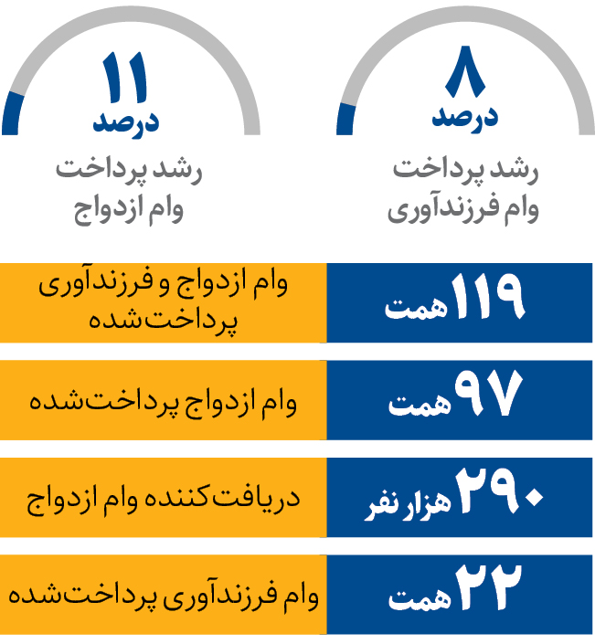 از ابتدای سالجاری ۱۱۹.۲همت وام ازدواج و فرزندآوری به ۵۳۰هزار نفر از متقاضیان پرداخت شده است. همچنین از ابتدای سالجاری تا پایان شهریورماه ۲۲هزار میلیارد تومان تسهیلات فرزندآوری به ۲۴۰هزار نفر از متقاضیان پرداخت شده که نسبت به دوره مشابه سال گذشته ۸درصد رشد داشته است.