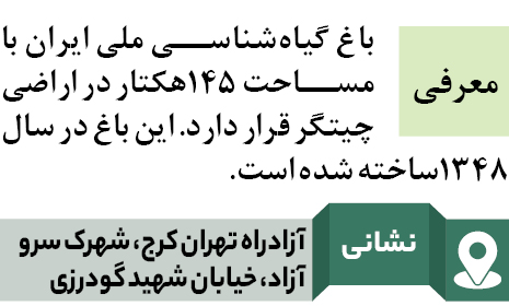 باغ گیاه‌شناسی با بیش از 3000گونه گیاهی از سراسر جهان، یکی از متفاوت‌ترین مقاصد طبیعت‌گردی در پایتخت است. از آنجا که سالمندان اغلب به حضور در فضای سبز و گشت و‌گذار در طبیعت علاقه دارند، تماشای بخش‌های متنوع این باغ می‌تواند برای آنها جذاب باشد. در طراحی باغ گیاه‌شناسی برای ایجاد مناظر و چشم‌اندازهای طبیعی فضای شبیه‌سازی‌شده کوه‌های زاگرس، البرز و هیمالیا به چشم می‌خورد. ۶ دریاچه و 2رودخانه که هر یک در کنار گیاهان رویشگاه‌ها فضای طبیعی ایجاد شده، نمایانگر طبیعت نقاط مختلف ایران و جهان است. از دیگر جاذبه‌های باغ گیاه‌شناسی، آبشارهایی است که منظره چشم‌نوازی ایجاد کرده است. در باغ گیاه‌شناسی، 7رویشگاه ایرانی مانند هیرکانی، زاگرس، البرز جنوبی، ایرانی-تورانی، گلخانه جنوب ایران، باغ پیازهای ایرانی و باغ‌ میوه‌های بومی ایران دیده می‌شود. 6رویشگاه جهانی ازجمله اروپا، چمنزارهای آمریکا، قفقاز، هیمالیا، چین و ژاپن نیز در این مجموعه وجود دارد.