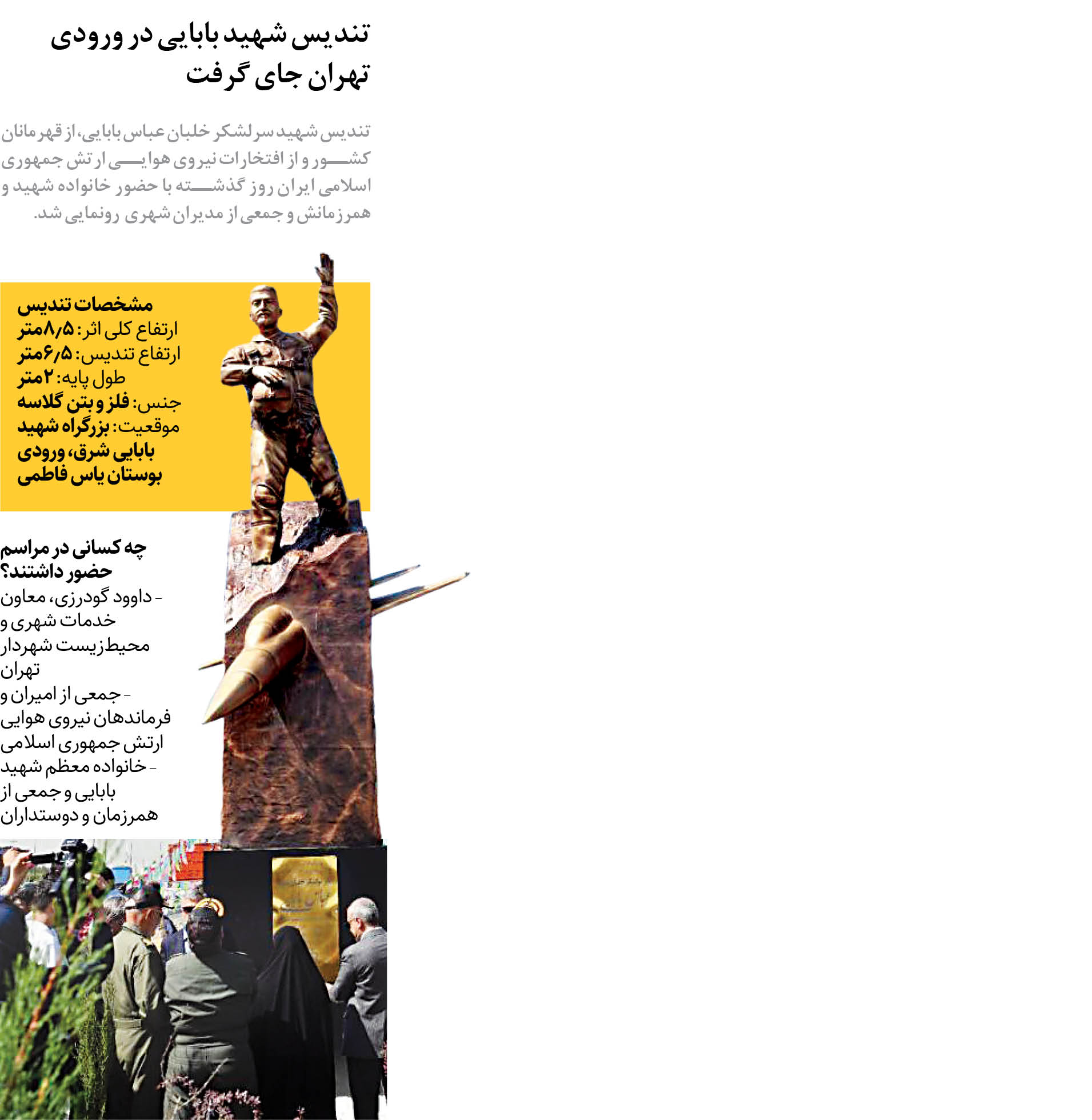 تندیس شهید سرلشکر خلبان عباس بابایی، از قهرمانان کشور و از افتخارات نیروی هوایی ارتش جمهوری اسلامی ایران روز گذشته با حضور خانواده شهید و همرزمانش و جمعی از مدیران شهری  رونمایی شد.