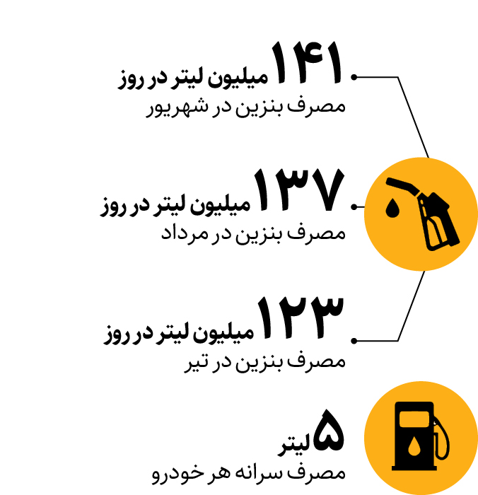 میانگین مصرف روزانه بنزین در تیرماه 123/5 میلیون لیتر، میانگین مصرف بنزین در مردادماه سالجاری ۱۳۷.۷ میلیون لیتر و میانگین مصرف بنزین در شهریورماه سالجاری ۱۴۱.۷ میلیون لیتر بوده که روندی رو به رشد است. مصرف بنزین در دهه اول شهریورماه یک میلیارد و ۴۰۹ میلیون لیتر، در دهه دوم یکمیلیارد و ۴۳۶ میلیون لیتر و در۱۱ روز پایانی اینماه یک میلیارد و ۵۴۵ میلیون لیتر بوده است. روند رو به رشد مصرف بنزین نشان میدهد که اولا باید با تولید خودروهای کممصرف به سمت کاهش مصرف بنزین بهعنوان حامل انرژی گرانقیمت برویم، ثانیا لازم است برای مصرف بیش از سهمیه حتماً قیمتهای متفاوتتری درنظر گرفته شود.