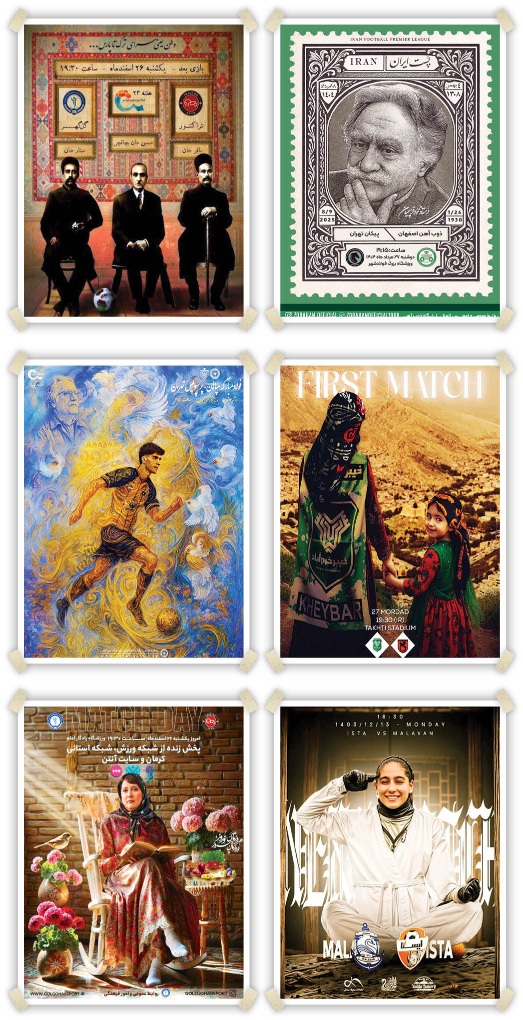 تلاش تیمهای فوتبال برای تغییر زمین بازی و همراه شدن با موضوعات فرهنگی موجب شد که پای مشاهیر ایران هم به پوسترهای قبل از شروع مسابقات باز شود. پروین اعتصامی، محمود فرشچیان در کنار قهرمانان ملی مورد توجه تیمهای فوتبال قرار گرفتند. گلگهر سیرجان یکی از همین تیمها بود و در آخرین روزهای 1403زمانی که قرار بود با تراکتور تبریز به رقابت بپردازد، در اقدامی خلاقانه، تصویر حسینخان بچاقچی قهرمان ملی اهل کرمان را در کنار ستارخان (سردار ملی) و باقرخان (سالار ملی) قرار داد تا این بار به جای کریخوانیهای بیفایده، یاد این قهرمانان وطندوست را تبدیل به همان نقطه اشتراک و وحدت کند. البته این تیم در یک پوستر دیگر که با رویکرد فرهنگی و برای همان مسابقه نقش زده شده بود، از تصویر پروین اعتصامی، شاعر شناخته شده اهل تبریز بهرهبرد. تیمهای اصفهانی هم علاقه خاصی به استاد محمود فرشچیان، نقاش معروف و چهره ماندگار معاصر و اهل اصفهان دارند و در هر بزنگاهی این هنرمند محبوب را به رخ تیم رقیب میکشند؛ درست مانند عرض اندام تیمهای ذوبآهن و سپاهان برای رقبا.