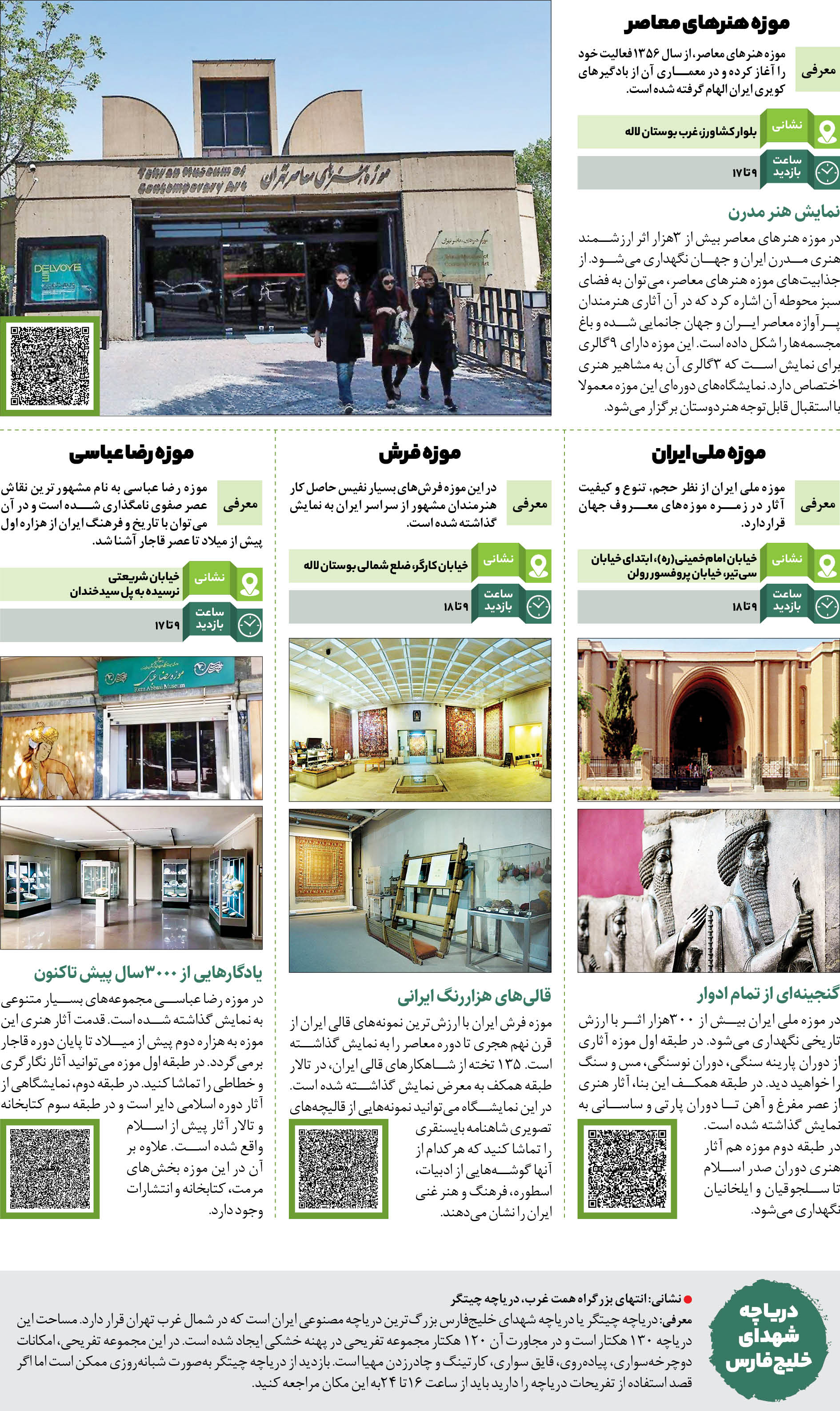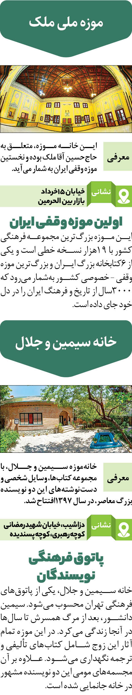 برای علاقه‌مندان به تماشای آثار موزه‌ای، گنجینه‌های تاریخی و یادگارهای ارزشمند گذشتگان، موزه‌های پایتخت مقاصد گردشگری محبوبی هستند. بعضی از موزه‌ها علمی یا هنری هستند و بعضی‌ها به نمایش آثار تاریخی اختصاص دارند. در بین ده‌ها موزه تهران، موزه‌های رضا عباسی، هنرهای معاصر ملی ایران، فرش، ملک، خانه مقدم و خانه سیمین و جلال آثار تاریخی و هنری ارزشمندی از دوره‌های مختلف ایران را در خود جای داده‌اند. تهران‌گردی بدون تماشای این موزه‌ها کامل نمی‌شود.