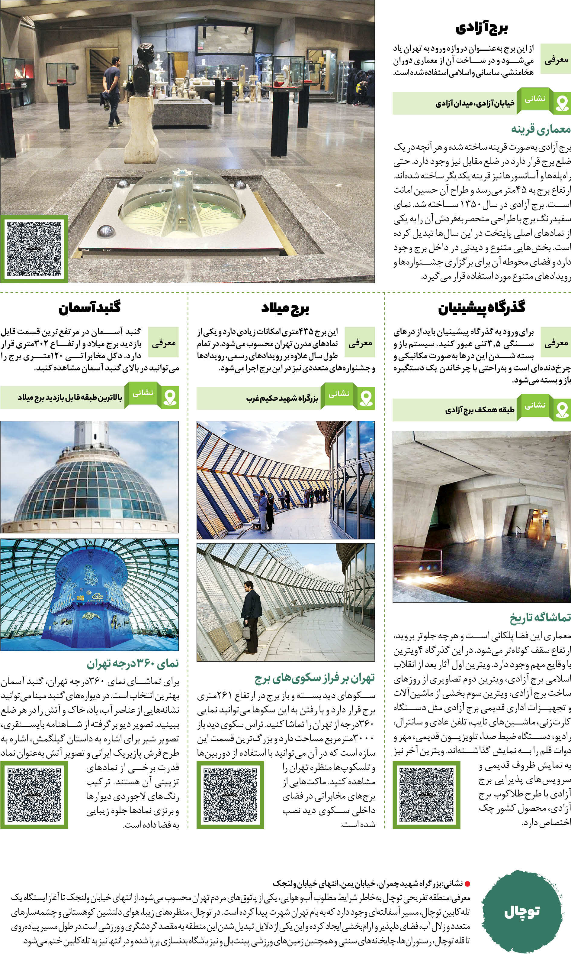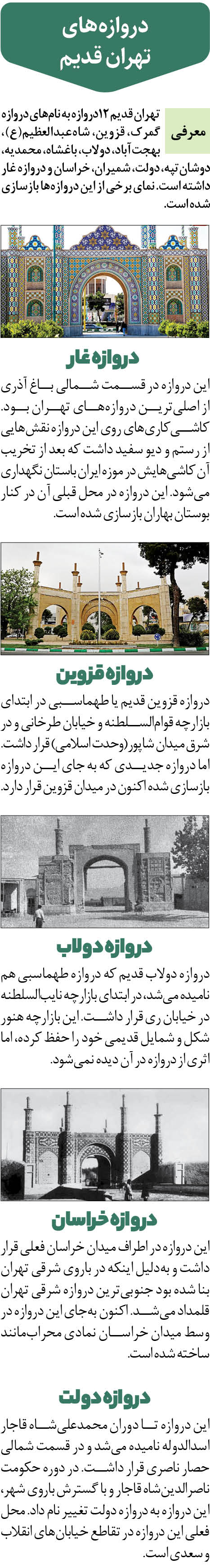 هر تصویری از تهران ببینید، حتما رد و نشانی از برج میلاد و برج آزادی به‌عنوان نمادهای پایتخت در آن وجود دارد. این دو برج معروف شهر تهران از مهم‌ترین جاذبه‌های این کلانشهرند و هر ساعت از روز که سراغشان بروید، بازار عکس‌های یادگاری با پس‌زمینه این برج‌ها داغ است. تا قبل از ساخت این برج‌ها دروازه‌های 12گانه تهران از نمادهای این شهر بودند که در گذر زمان و با گسترده‌شدن پایتخت تخریب شدند. چند سالی می‌شود که شهرداری تعدادی از آنها را بازسازی کرده است. در این گزارش برخی از قسمت‌های دیدنی برج‌های آزادی و میلاد و محل قدیمی و فعلی تعدادی از دروازه‌های قدیمی تهران را معرفی کرده‌ایم.