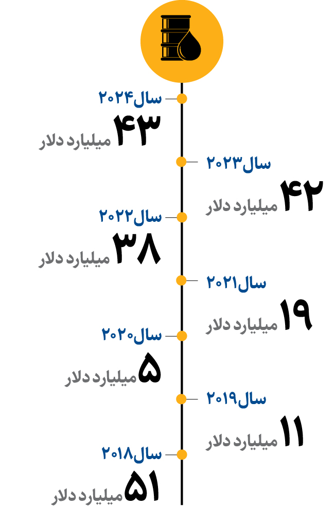 برآوردهای اداره اطلاعات انرژی آمریکا نشان می‌دهد که درآمدهای نفتی ایران در سال ۲۰۲۴ با یک‌میلیارد دلار افزایش به ۴۳ میلیارد دلار رسیده است. براساس این آمار، درآمدهای نفتی ایران در سال ۲۰۲۳ برابر با ۴۲ میلیارد دلار بوده و این رقم در سال ۲۰۲۲ هم ۳۸ میلیارد دلار تخمین زده شده است.به این ترتیب، میزان درآمدهای نفتی ایران از سال ۲۰۲۲ تا ۲۰۲۴ رقمی معادل ۵‌میلیارد دلار افزایش داشته است. براساس گزارش این اداره که بازوی تحلیلی و آماری وزارت انرژی آمریکاست، ایران در سال ۲۰۱۸ یعنی سال خروج آمریکا از برجام ۵۱‌میلیارد دلار درآمد از محل فروش نفت و میعانات نفتی کسب و با خروج آمریکا این رقم به ۱۱ میلیارد دلار نزول کرده است. اما با وجود تحریم‌های موسوم به فشار حداکثری و تلاش دولت ترامپ برای صفرکردن صادرات نفت ایران، میزان درآمد نفتی ایران با رشد ۳۲‌میلیارد دلاری طی ۶‌سال گذشته در حال نزدیک‌شدن به رقم صادرات سال ۲۰۱۸ است.