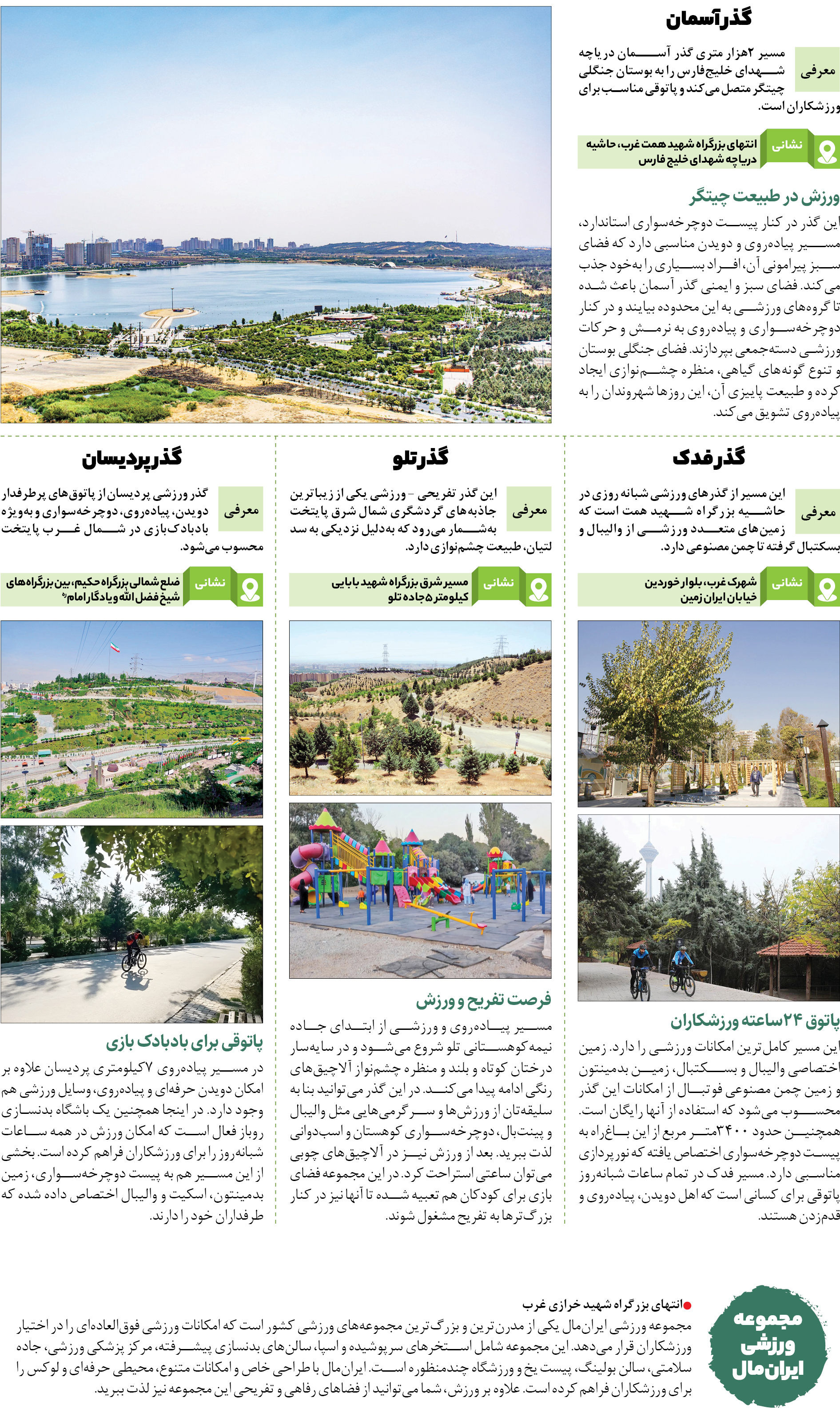 این روزها ورزش کردن در شهری مانند تهران چندان کار سختی نیست. بهویژه آنکه برخی از معابر و خیابانهای پایتخت، با عنوان گذرهای تندرستی و ورزشی به مکانی برای فعالیتهای ورزشی و پاتوقی ایدهآل برای ورزشکاران تبدیل شدهاند. در بیشتر این گذرها امکانات ورزشی از مسیرهای خطکشیشده برای دوچرخهسواری و پیادهروی گرفته تا وسایل و دستگاههای ورزشی و بدنسازی وجود دارد. این تنوع امکانات باعث شده تا شهروندان بسیاری به این گذرها بیایند و بهصورت فردی یا گروهی به فعالیتهای ورزشی بپردازند.