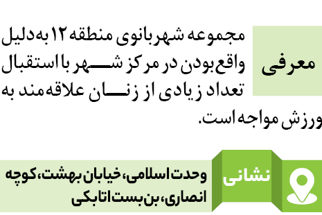 مجموعه شهربانوی منطقه12 در سال1390 به بهرهبرداری رسیده و از ساعت 8 تا 20 پذیرای بانوان و دختران است. در این مرکز سالن بدنسازی، ایروبیک و ورزشهای هوازی برای تحرک بانوان و ارتقای سلامت آنها مهیاست.