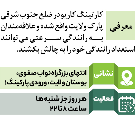 کارتینگ کاریو جزو طولانی‌ترین پیست‌های تهران به شمار می‌آید. در حاشیه این پیست موانع کمتری قرار دارد و خاکی است، بنابراین اگر راننده‌ای حرفه‌ای نباشد نمی‌تواند با سرعت بیشتر از 50کیلومتر بر ساعت رانندگی کند؛ هرچند برای افراد حرفه‌ای این امکان فراهم شده که از هم سبقت بگیرند و برای اول شدن تلاش کنند. از امتیازهای مجموعه کاریو اینکه خانم‌ها و آقایان می‌توانند همزمان از امکانات آن استفاده کنند. گردشگران بعد از رانندگی می‌توانند از خدمات رفاهی کارتینگ مثل شهربازی، باشگاه ورزشی، زمین کریکت، فودکورت و دوچرخه استفاده کنند.