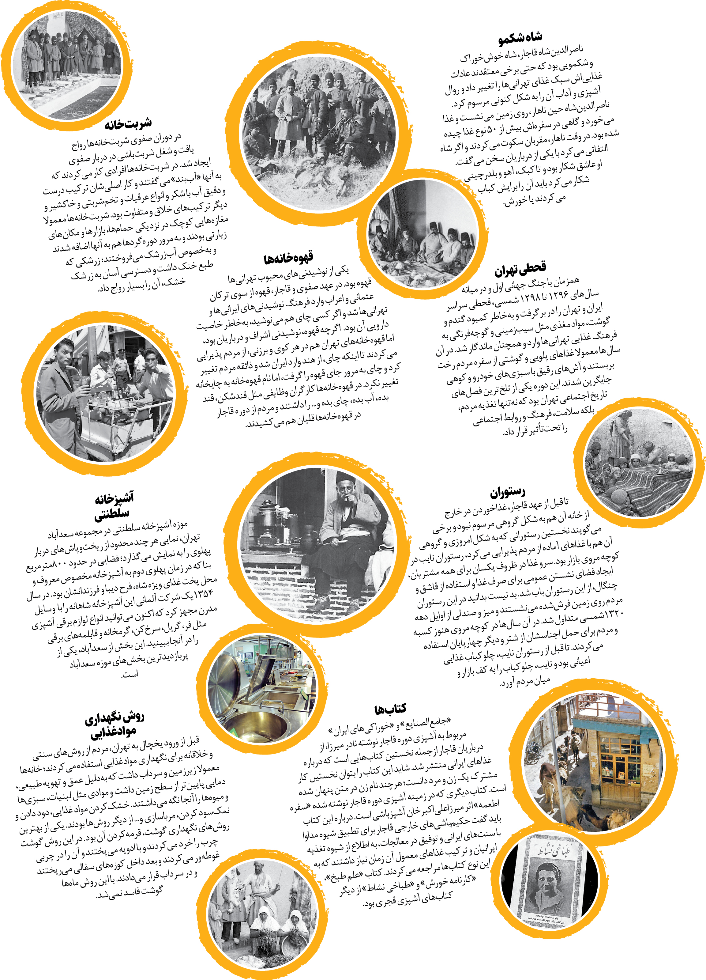 در تهران قدیم، غذا نهتنها وسیلهای برای تغذیه که ابزاری برای مهماننوازی و نشست و برخاستهای اجتماعی و محلی و خانوادگی بود. قدیمیها از همان صبح زود در صفهای طولانی نان سنگک و بربری میایستادند و نان داغ به خانه میبردند و سماورهای زغالی را روشن و صبح را با نان، پنیر و گردوی تازه و چای شیرین آغاز میکردند. ناهار اما وعده مهمی برای تهرانیها بود و گاهی بوی دیزیهای سفالی و قیمهها و قرمهها، کوچه به کوچه در محلهها میپیچید و در این فرآیند، البته پایتختنشینان به کیفیت و تازگی موادغذایی اهمیت فراوان میدادند. شام وعدهای سبک شامل نان، پنیر و سبزیخوردن و آشهای سادهای بود که معمولا زنان تهرانی آش رشته را پیاله پیاله میکردند و به در و همسایه میدانند تا نکند بوی غذای مطبخ در کوچه پیچیده باشد و همسایهای هوس آش رشته کند! البته ماجرای غذا در جهان، جریان بااهمیتی است و از سال 1981میلادی به پیشنهاد سازمان ملل متحد، 16اکتبر را روز جهانی غذا نامیدند؛ روزی که بهانهای است برای افزایش آگاهی جهانی درباره گرسنگی و سوءتغذیه، ترویج تغذیه سالم و... . به این بهانه، سری به کوچهپسکوچههای قدیمی شهر در طول تاریخ تهران میزنیم و آداب و رسوم تهرانیهای قدیم، از شاه تا وکیل، کاسب و فقیر را بررسی میکنیم.