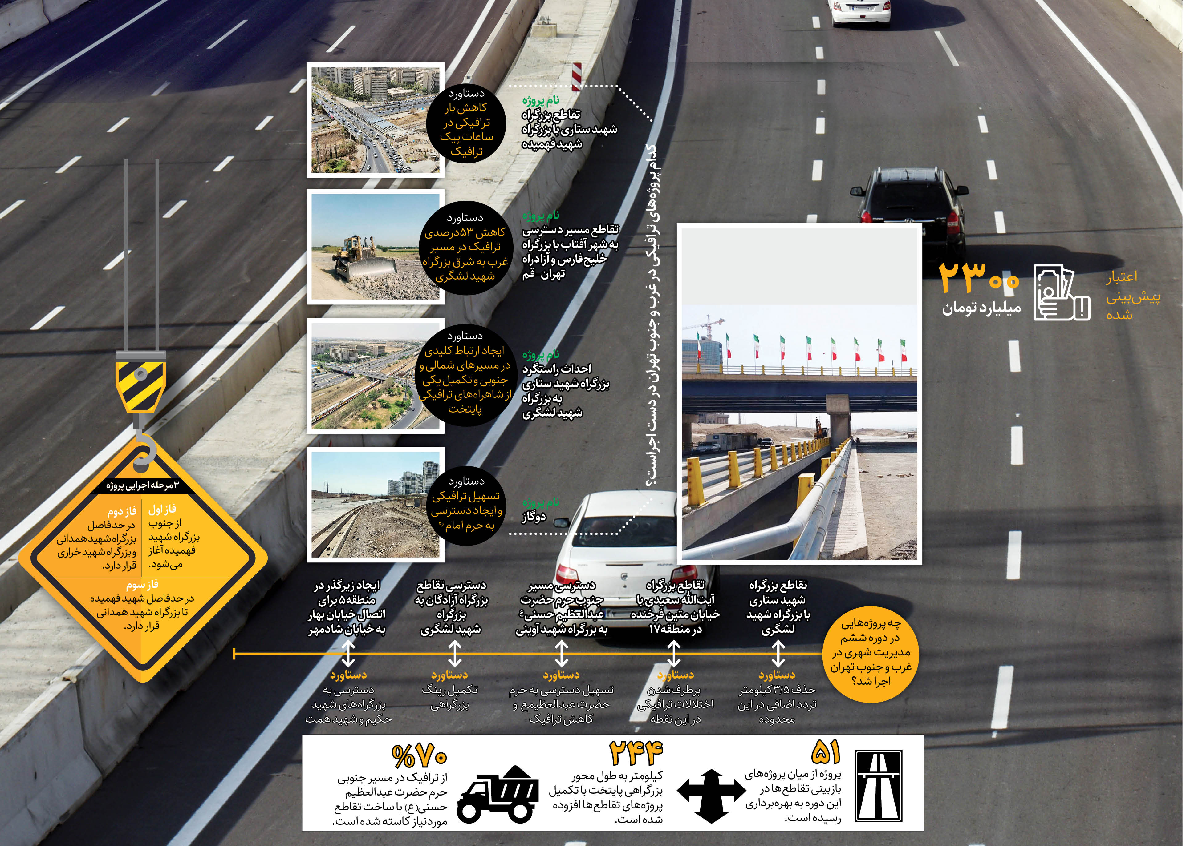 این روزها پروژه‌های عمرانی و ترافیکی متعددی در همه مناطق شهر بدون تعطیلی فعالند. در غرب و جنوب تهران هم با توجه به حجم ترددها طرح‌های زیادی در قالب ساخت تقاطع‌های غیرهمسطح و بزرگراه‌ها در حال اجراست تا از حجم ترافیک کاسته و طول مسیرها کم شود. برخی از این پروژه‌ها مانند دوگاز به‌زودی به بهره‌برداری می‌رسد. مهدی میرسیدی، مدیر پروژه‌های غرب و جنوب تهران درباره این پروژه‌ها بیشتر توضیح داده است.