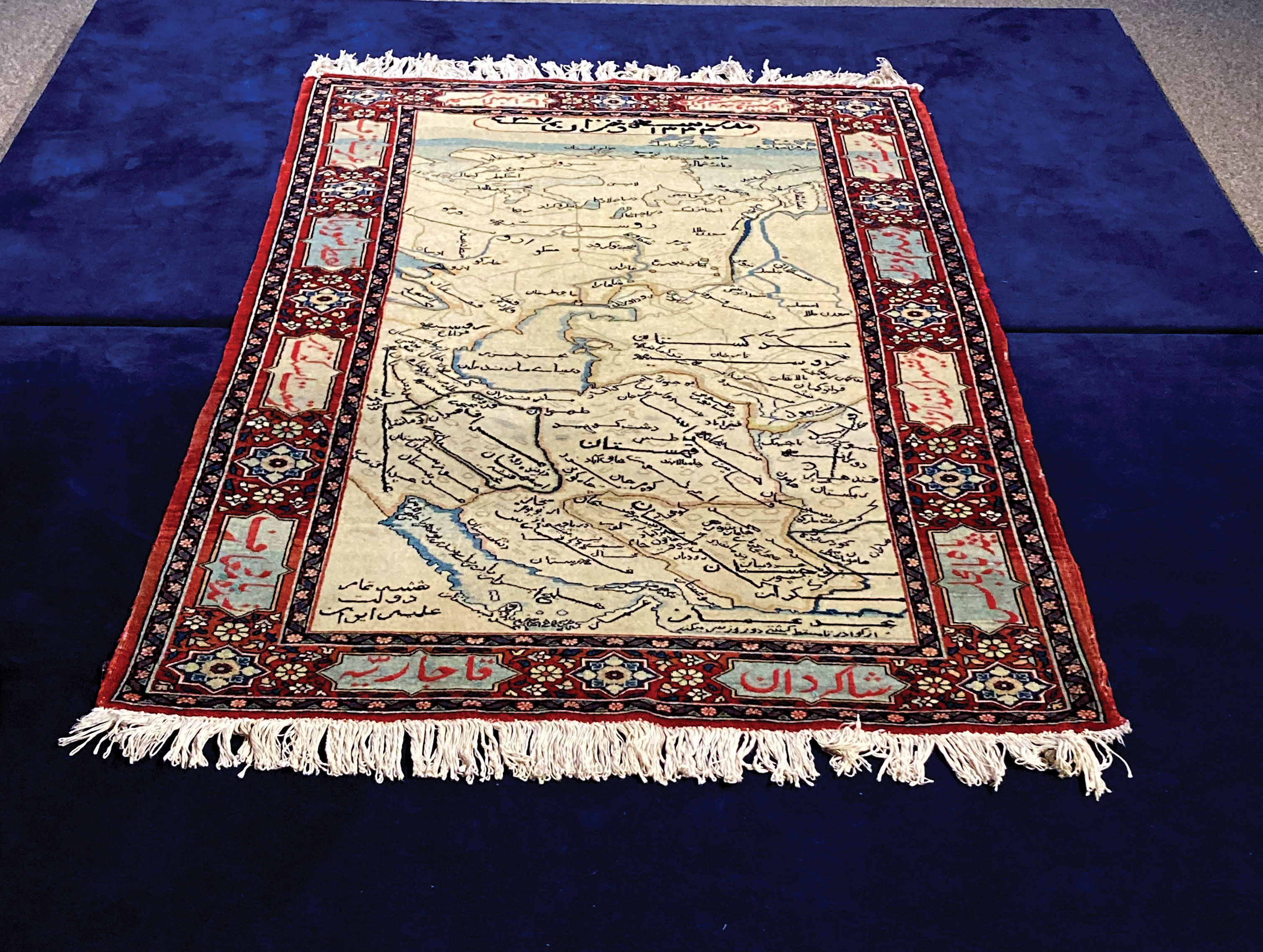 وقتی دختران مدرسهای در تهران، قالیچهای به نقش نقشه ایران با نام «نقشه تمام دولت علیه ایران» میبافتند تا خودی به معلمهای فرنگی و غیرفرنگی خود نشان دهند، هیچ خیال نمیکردند 100سال بعد در موزه فرش، در هفته تهران از آن با کلی شکوه و شوکت رونمایی خواهد شد. دخترانی که نه تعداد و نه اسم و رسمشان جایی ثبت شده، اما در 2نقطه (شمالشرقی) از قالیچه عبارت «معدن طلا» را بافته و خلیجفارس را نیز از دفتین (شانه؛ یکی از ابزار قالیبافی) و قیچی نینداختهاند. «از معادن طلایی که در نقشه بافته شده تاکنون اثری نبوده و نیست!» این را پورجمع هنگام تور قالیگردی در موزه میگوید.