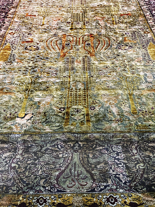 یکی از قدیمیترین قالیهای موزه، همین است که به قاب حاشیه آن در 4طرف بافتهاند: «مبارک باد». جنسی از ابریشم دارد و راهنما در نقل داستانش میگوید: «رسم بوده برای عرض تبریک و مبارکباد اتفاقی خوش از عروسی و تولد گرفته تا منصوب شدن به شغلی حکومتی و حتی فراوانی برداشت محصول از زمین و باغ، فرشی دستبافت با حاشیهنویسی شادباش، هدیه میدادهاند.»