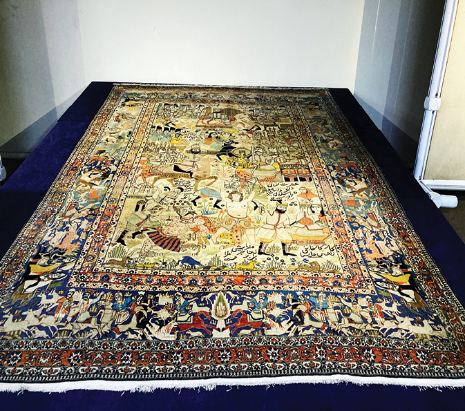 بی برو برگرد در جمله هنرهای ایرانی، نشانی از شاهنامه هست؛ انگار که ادای دین هنرمندان است به جناب فردوسی؛ از این روست که قالی «نقاشی قهوهخانهای» با چند روایت از شاهنامه بر یکی از سکوهای موزه خوشنمایی میکند. کار دستبافندگان کاشانی در روزگار قاجار است که جایی در گوشه سمت راست آن بافتهشدهاست: «کار کارخانه ملاحسن».