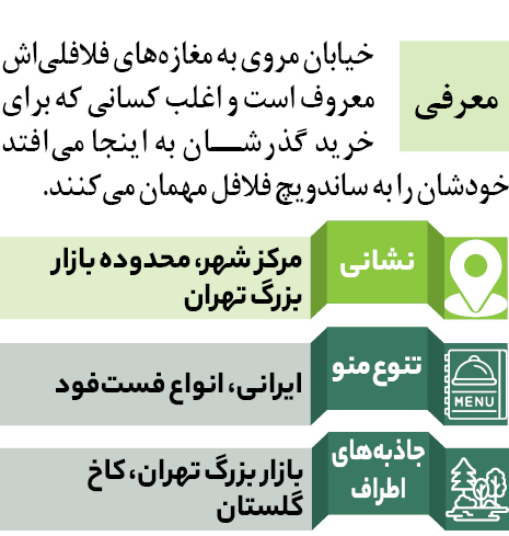تعداد اغذیهفروشیهای خیابان مروی از مقابل شمسالعماره تا پامنار به قدری زیاد است که این مسیر پیادهراه را به راسته غذا تبدیل کرده است. در این محدوده بیشتر غذاهای ساده یا ساندویچ ارزانقیمت فروخته میشود. البته اگر کسی تمایل به خوردن غذا در رستوران دارد، تعدادی رستوران هم در کوچه پسکوچههای خیابان مروی وجود دارد.