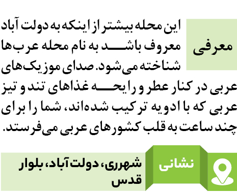در هر دو طرف بلوار قدس دولتآباد میتوانید فروشگاههای باقلوا و شاورما را ببینید. اگر هم عاشق سمبوسه و فلافل هستید میتوانید با کمی قدم زدن خود را به مغازههایی برسانید که عطر فلافلهای سرخ شده و سمبوسههای تردشان خیابان را برمیدارد.در این محله میتوانید انواع غذاهای عربی را امتحان کنید. منوهای بیشتر مغازهها به جای فارسی و انگلیسی به زبان عربی و فارسی است و نام مغازهها نیز از فرهنگ عربی گرفته شده است.