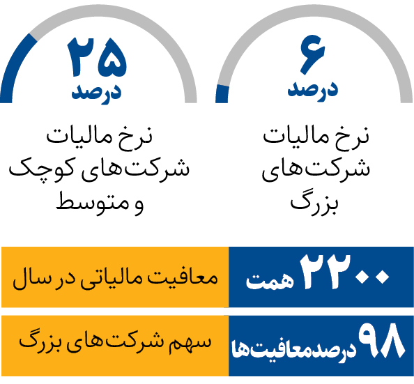 بهگفته یکی از نمایندگان مجلس و براساس گزارش سازمان امور مالیاتی سالانه بیش از 2200همت معافیت مالیاتی معادل حدود 20میلیارد دلار داده میشود که 98درصد این معافیتها محدود به یکدرصد شرکتهای بزرگ است.