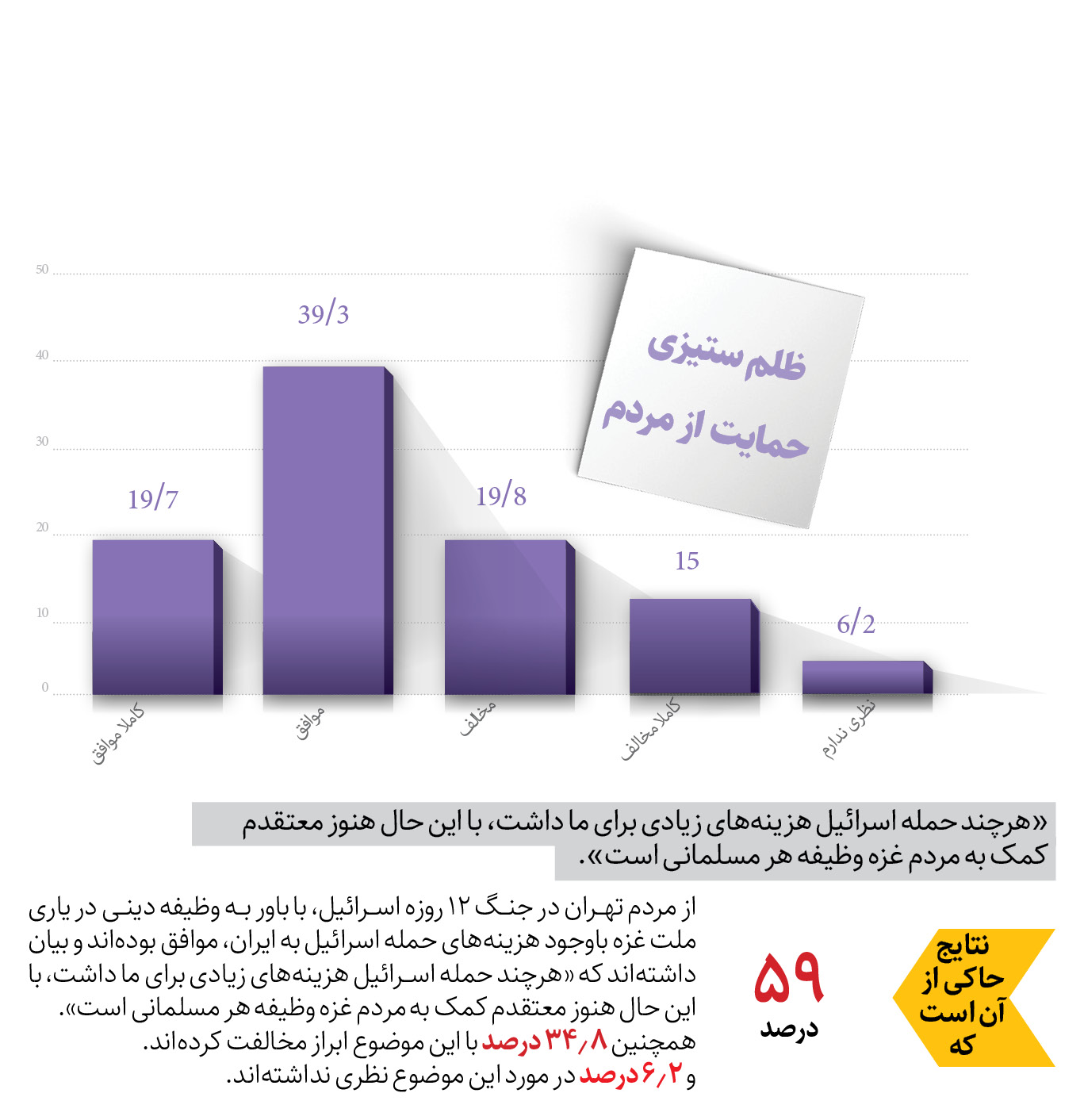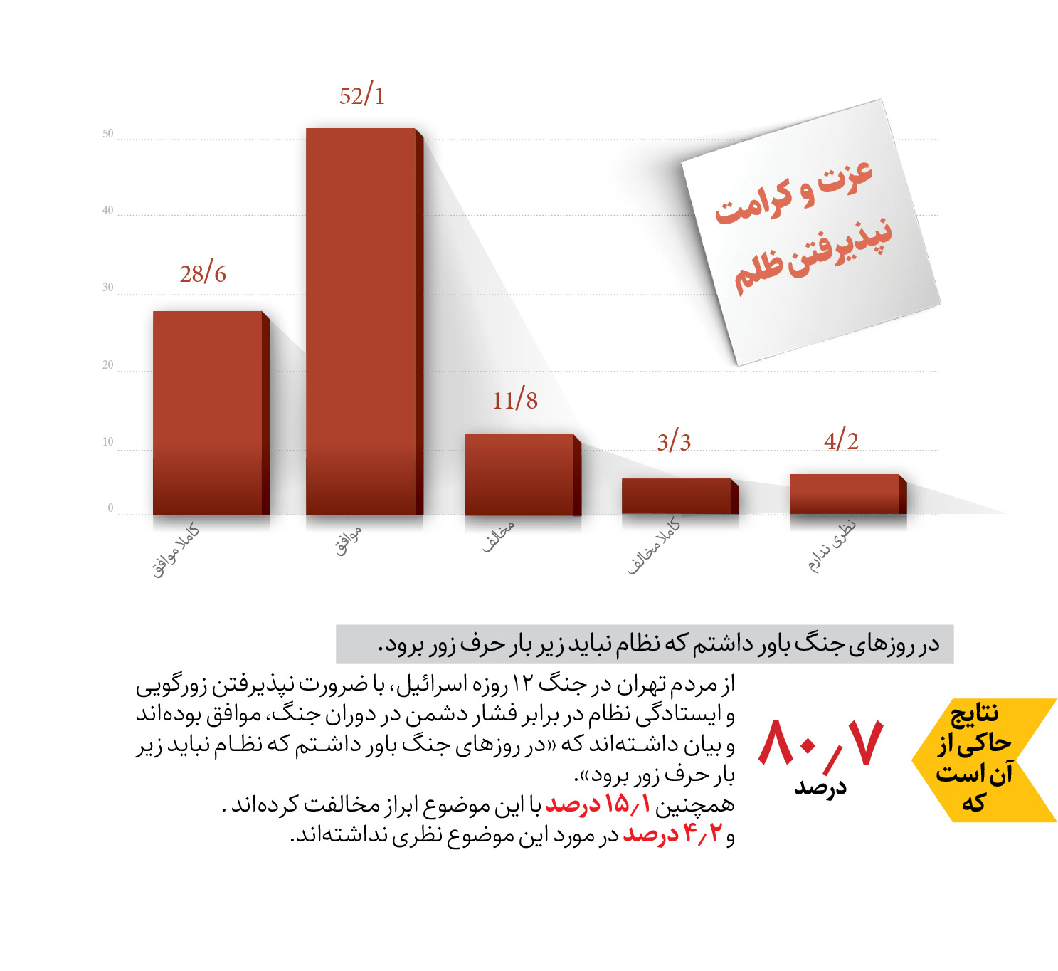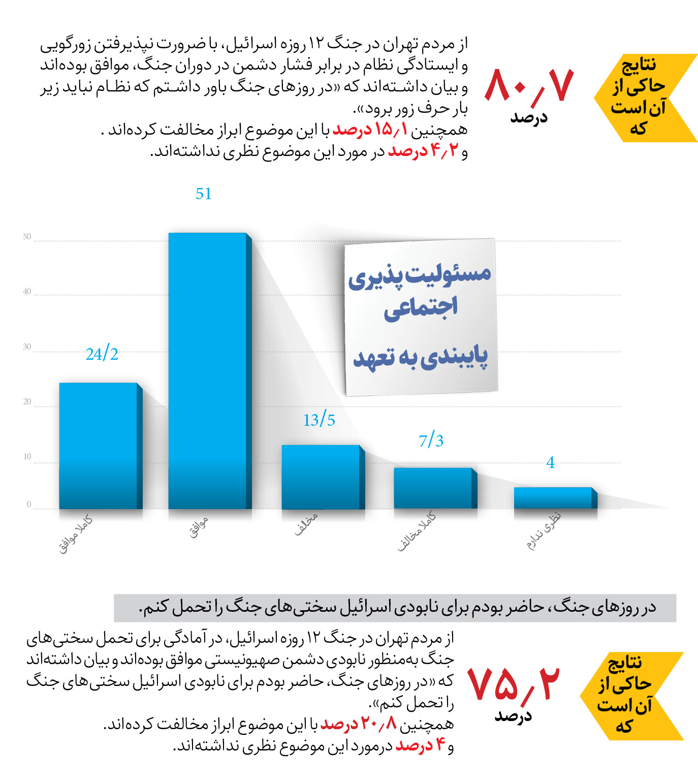 بر اساس این نظرسنجی 86.1 درصد از مردم تهران در جنگ 12 روزه اسرائیل، با آرامشبخشی به دیگران از طریق یادآوری یاری خداوند در شرایط جنگ، موافق بودهاند و بیان داشتهاند که «در روزهای جنگ، با یادآوری کمک خداوند، به دیگران آرامش میدادم». همچنین 65.6 درصد ترسی از کشته شدن در جنگ نداشتند.