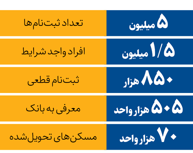 از زمان آغاز طرح نهضت ملی مسکن و تصویب قانون جهش تولید مسکن پس از سال۱۴۰۰، بیش از ۵میلیون نفر ثبت‌نام کرده‌اند. از این تعداد، حدود یک‌میلیون‌و۵۰۰هزار نفر واجد شرایط شناخته شدند که از میان آنها حدود ۸۵۰هزار نفر وارد فرآیند سپرده‌گذاری و واگذاری واحدها شده‌اند.