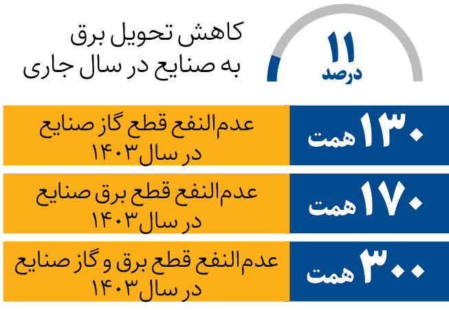 بهگفته وی، این میزان خسارت شامل ۱۳۰ هزار میلیارد تومان در بخش گاز و ۱۷۰هزار میلیارد تومان در بخش برق است. پیشبینیها نشان میدهد که این عدمتوازن در سالجاری نیز تشدید خواهد شد و کاهش شدید تحویل برق به صنایع باعث افزایش هزینههای تولید خواهد شد. گرشاسبی همچنین از کاهش ۱۱ درصدی تحویل برق به صنایع در 5ماه نخست سالجاری خبر داده است. وی افزود که این کاهش در میزان انرژی تحویلی به تولیدات صنعتی، علاوه بر تأثیر منفی بر پایداری انرژی کشور، موجب افزایش چشمگیر هزینههای تولید شده است. گرشاسبی بیان داشت: محاسبات معاونت برنامهریزی وزارت صمت نشان میدهد که هزینه تولید برق در حال حاضر بیش از 3 برابر تعرفههای رسمی است که دولت برای مصرفکنندگان خانگی و صنعتی اعلام کرده است.