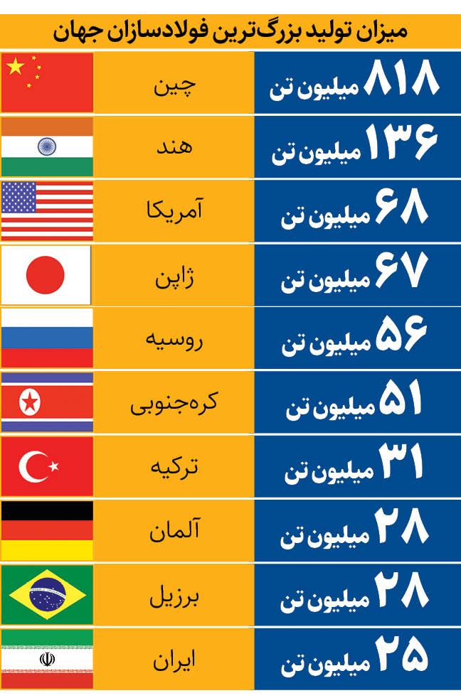 جدیدترین آمار انجمن جهانی فولاد نشان میدهد که میزان تولید فولاد ایران در ۱۰ماه نخست ۲۰۲۵ بهطور متوسط ۲۵.۴ میلیون تن بوده که یک درصد کمتر از مدت مشابه سال پیش از آن است. با این حال ایران در بین 10تولیدکننده بزرگ فولاد جهان قرار دارد. 70کشور تولیدکننده فولاد در ماه اکتبر در مجموع ۱۴۳.۳ میلیون تن فولاد تولید کردهاند که در مقایسه با اکتبر سال گذشته، ۵.۹ درصد کاهش یافته است. همچنین تولید جهانی فولاد در ۱۰ ماه نخست سال ۲۰۲۵ به ۱۵۱۷.۶ میلیون تن رسیده که نسبت بهمدت مشابه سال قبل، ۲.۱ درصد کمتر است. آمارهای انجمن جهانی فولاد نشان میدهد که ایران در ماه اکتبر، دهمین ماه میلادی ۳.۳ میلیون تن فولاد تولید کرده که ۱۲ درصد از مدت مشابه سال گذشته بیشتر است. ایران در ماههای مارس، آوریل و می۲۰۲۵ در جایگاه هفتم تولید فولاد در جهان قرار گرفت اما در ماه ژوئن در جایگاه دهم نشست و تا ماه سپتامبر در این جایگاه قرار داشت و در ماه اکتبر با ۳ پله صعود به جایگاه هفتم بازگشت. چین، هند و آمریکا در این ماه، ۳ تولیدکننده بزرگ فولاد در جهان بودند.