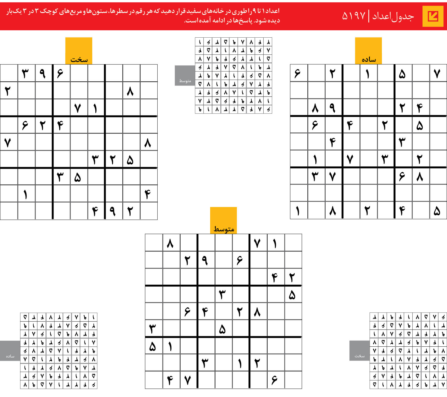 اعداد 1 تا 9 را طوري در خانههاي سفيد قرار دهيد كه هر رقم در سطرها، ستونها و مربعهاي كوچك 3 در 3 يكبار ديده شود. پاسخها در ادامه آمده است.