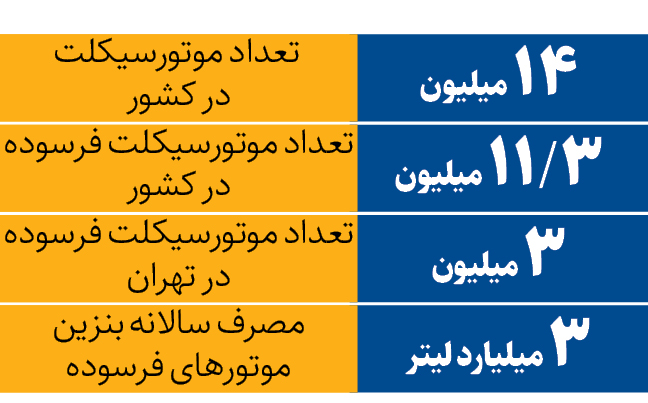هماکنون نزدیک ۱۴میلیون موتورسیکلت در کشور تردد دارند که از این میزان حدود ۱۱میلیون و ۳۰۰هزار دستگاه فرسوده یا در مرز فرسودگی هستند. تنها در تهران حدود 3میلیون موتورسیکلت فرسوده تردد میکنند. این ۱۱میلیون و ۳۰۰هزار موتورسیکلت فرسوده سالانه حدود 3میلیارد لیتر بنزین مصرف و از نظر آلایندگی، معادل ۲میلیون و