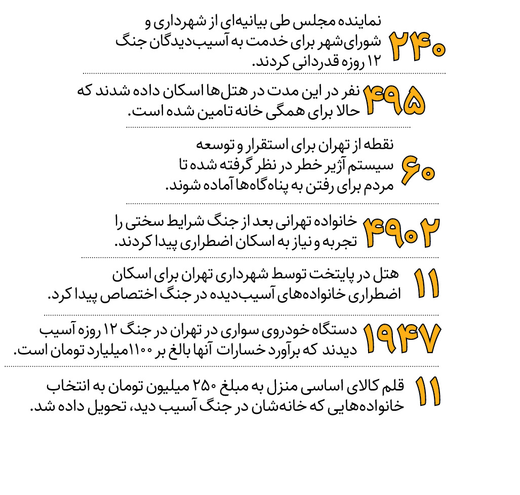 6 ماه از حمله ناجوانمردانه اسرائیل به خاک وطن گذشته است. شهرداری تهران به عنوان فعالترین نهاد در رسیدگی به وضعیت آسیبدیدگان، تعمیر، تخریب و نوسازی ساختمانهای آسیبدیده، حمایت از شهروندان و زنده نگه داشتن یاد شهدای این جنگ تحمیلی، تمام توان خود را برای مداوای زخم جنگ به کار گرفت. این گزارش، مروری است بر همه اقدامات شهرداری تهران در روزهای جنگ 12 روزه و پس از آن.