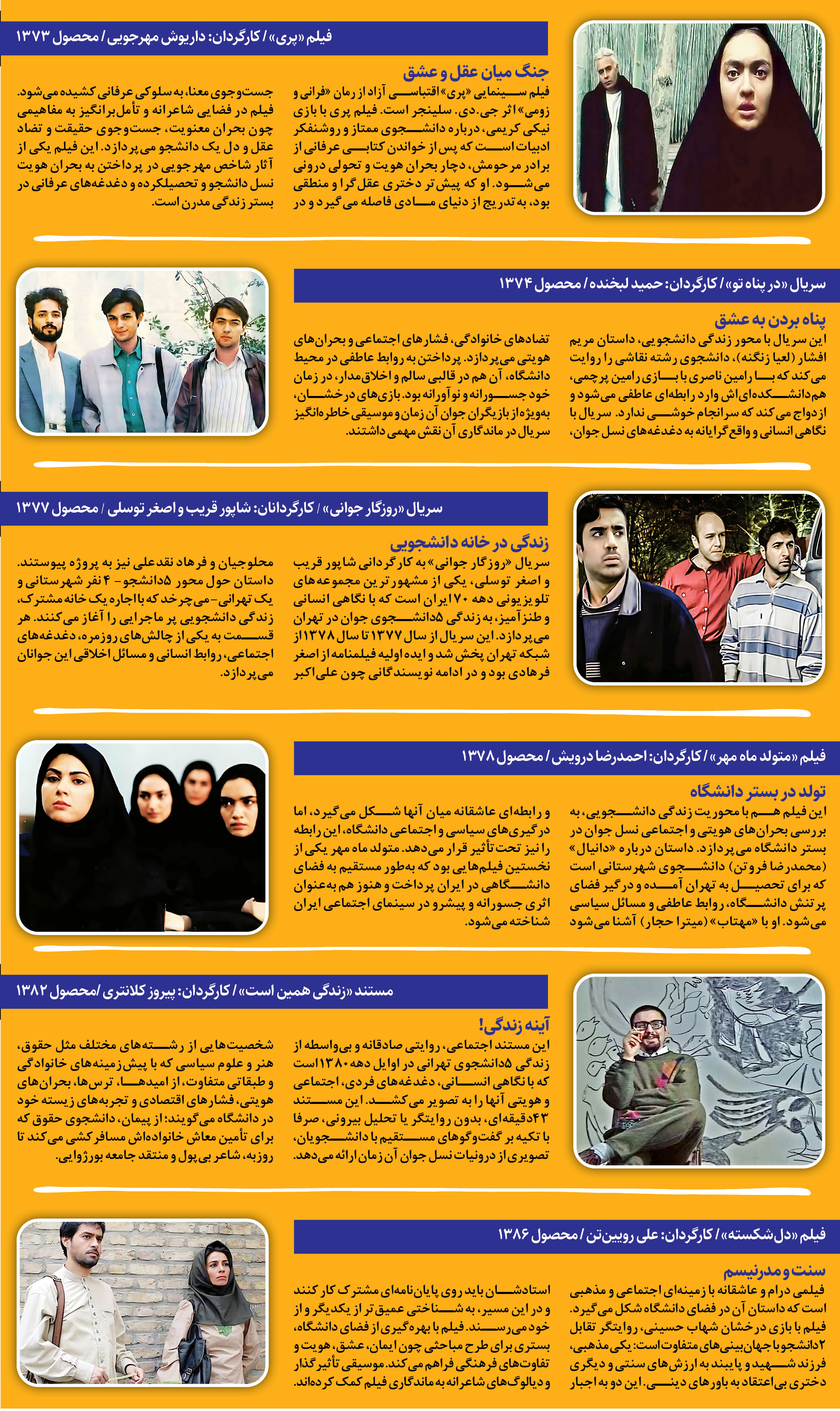 16آذر روز دانشجو است؛ روزی که ما را به یاد یک واقعه مهم تاریخی می‌اندازد؛ ماجرایی که در سال1332 رخ داد و در آن 3دانشجوی دانشگاه تهران در جریان اعتراض به سفر معاون رئیس‌جمهور وقت آمریکا و همچنین از سرگیری روابط ایران و انگلیس پس از کودتای 28مرداد، توسط نیروهای رژیم پهلوی در دانشکده فنی دانشگاه تهران به شهادت رسیدند. این روز به نماد مقاومت دانشجویان در برابر استبداد تبدیل شد و به‌عنوان روز پاسداشت آگاهی، عدالت‌خواهی و استقلال‌طلبی در تاریخ معاصر ما شناخته می‌شود. بسیاری معتقدند کار اصلی دانشجو، کسب علم و آگاهی است، اما نقش او تنها به فراگیری دانش محدود نمی‌شود بلکه با مشارکت در فعالیت‌های علمی، فرهنگی، اجتماعی و سیاسی در شکل‌گیری آینده هر کشور نقش‌آفرینی می‌کند. اما دانشجو کیست و زندگی دانشجویی چگونه است؟ یکی از راه‌های کشف پاسخ این سؤال، تجربه‌کردن این دوران جذاب و باشکوه است، اما اگر امکان چنین فرصتی به این زودی‌ها برای ما فراهم نمی‌شود، راه دیگری هم برای تجربه این دوران باشکوه وجود دارد؛ تماشای فیلم‌ها و سریال‌هایی که قهرمانان اصلی آن دانشجویان هستند و در آنها به کنش‌ها و واکنش‌های دانشجویان می‌پردازند.  در اینجا 6  فیلم و سریال ایرانی معرفی می‌کنیم که چالش‌های دوران دانشجویی را جلوی دوربین آورده‌اند و ما را با فراز و فرودهای دوران دانشجویی در ایران آشنا می‌کنند.
