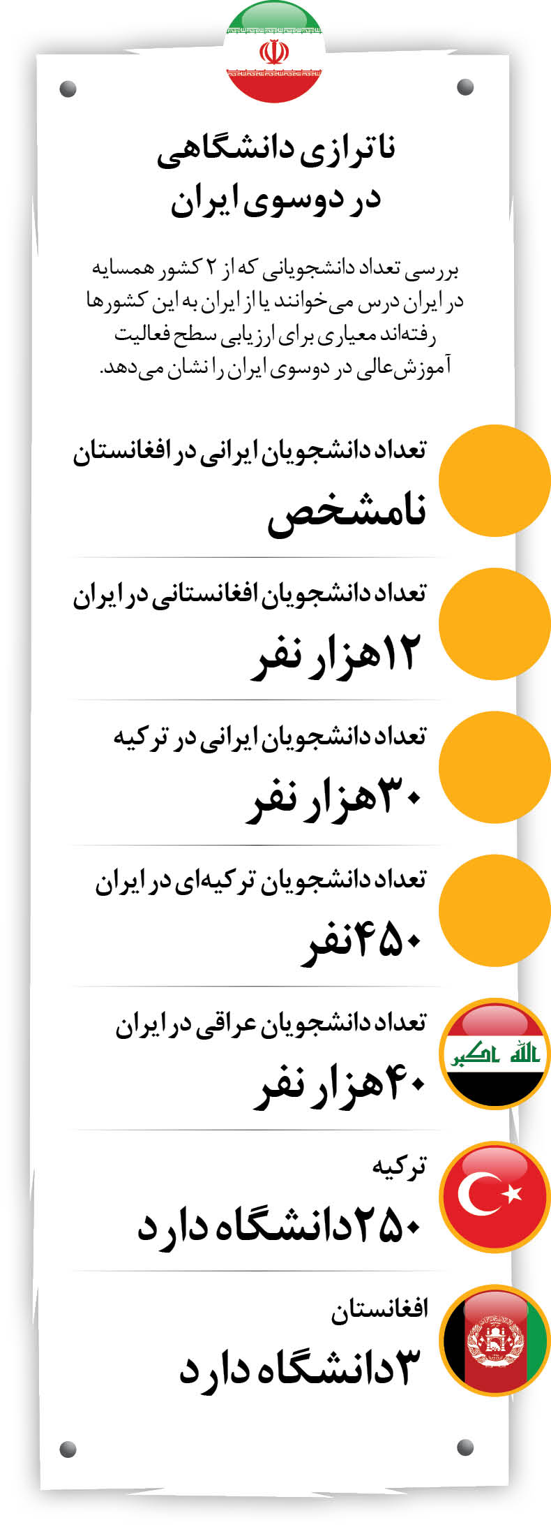 تفاوت آموزش عالی در دوسوی ایران به حدی است که می‌توان گفت دانشگاه‌های افغانستان و ترکیه در 2 جهان مختلف قرار دارند. 2 دیدار پشت سر هم در وزارت علوم، به وضوح نشان داد که دانشگاه‌های 2 کشور همسایه چقدر با یکدیگر تفاوت دارند. وزیر علوم ایران در گفت‌وگو با وزیر علوم امارت اسلامی افغانستان اصرار داشت که دختران باید در دانشگاه‌های افغانستان اجازه تحصیل پیدا کنند و ایران حاضر به همکاری و کمک در این زمینه است. در مقابل، گفت‌وگوی وزیر علوم با سفیر ترکیه در تهران به تعیین سطح علمی دانشگاه‌ها و فهرست برترین مراکز علمی و مدارک تحصیلی دکتری اختصاص پیدا کرد.
