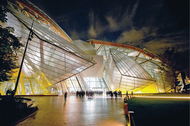 یکی از آثار برجسته او، بنیاد لویی ویتون در پاریس است که در سال۲۰۱۴ در پارک بوا دو بولونی افتتاح شد. این موزه هنری با الهام از معماری شیشهای قرن نوزدهم طراحی شده و بهعنوان «کشتی باشکوهی برای پاریس» توصیف میشود. نمای شیشهای آن که به شکل تودههایی شبیه «کوه یخ» طراحی شده، با محیط طبیعی اطراف هماهنگ است و بازی نور و انعکاس را به نمایش میگذارد.