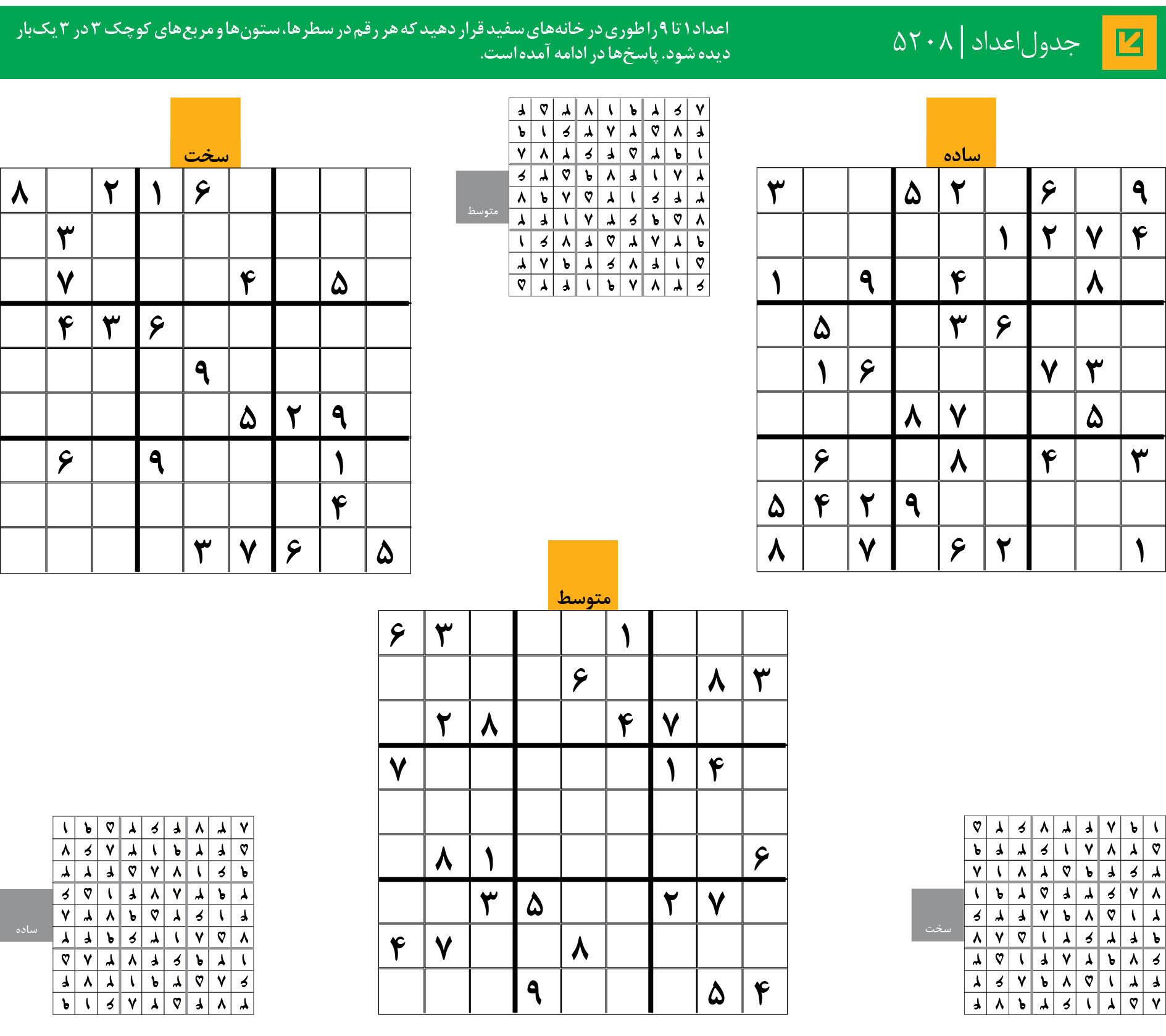 اعداد 1 تا 9 را طوري در خانههاي سفيد قرار دهيد كه هر رقم در سطرها، ستونها و مربعهاي كوچك 3 در 3 يكبار ديده شود. پاسخها در ادامه آمده است.