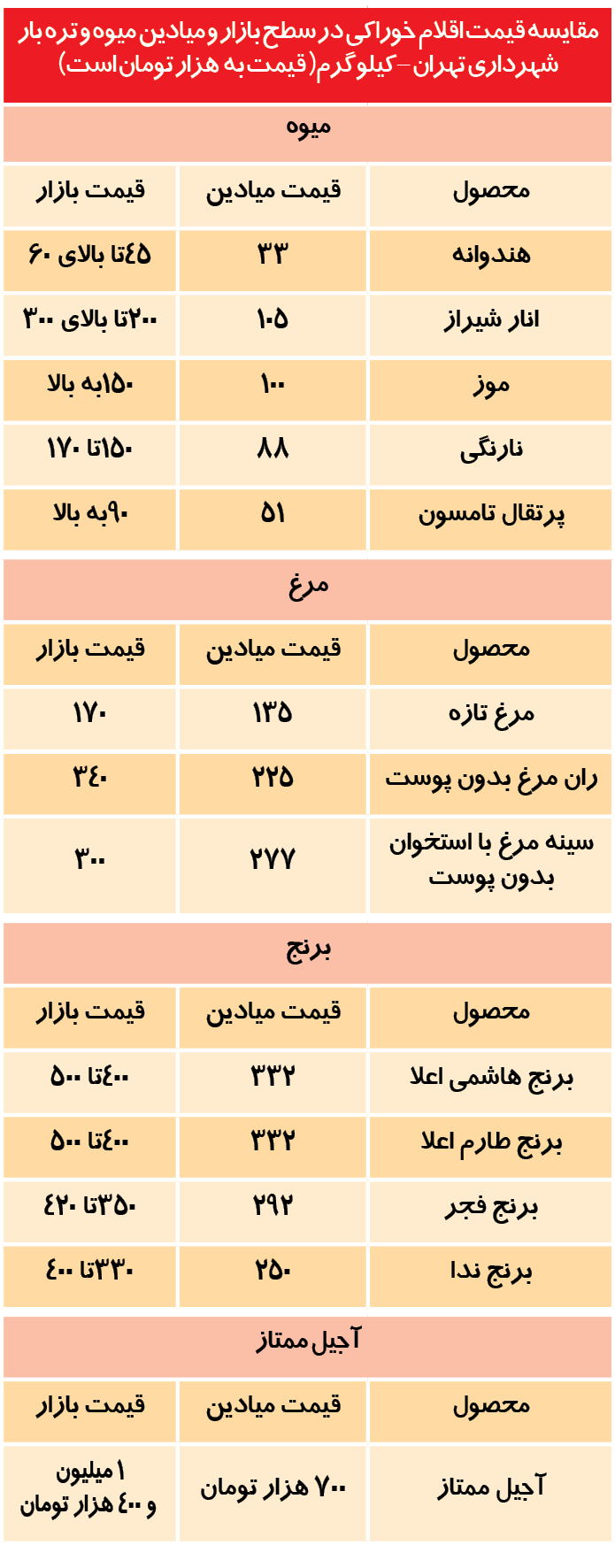 قیمت هر کیلو مرغ در خردهفروشیها ۱۶۰ تا ۱۷۰ هزارتومان است؛ اما همین مرغ در میادین کیلویی 135هزار و 700تومان عرضه میشود. قیمت بستهبندیهای ران و سینه نیز همین مقدار تفاوت دارد و در میادین حدود 20درصد ارزانتر از بازار است. برای گوشت قرمز هم اگرچه یک کیلو گوشت گوسفندی بااستخوان در سطح شهر یکمیلیون و 310هزار تومان است؛ اما در میادین شهرداری هر کیلو بین 800تا 900هزار تومان فروخته میشود که بیانگر اختلاف بیش از 50درصدی است. در میادین ماهی را هم بسیار بهصرفهتر از سطح شهر میفروشند.