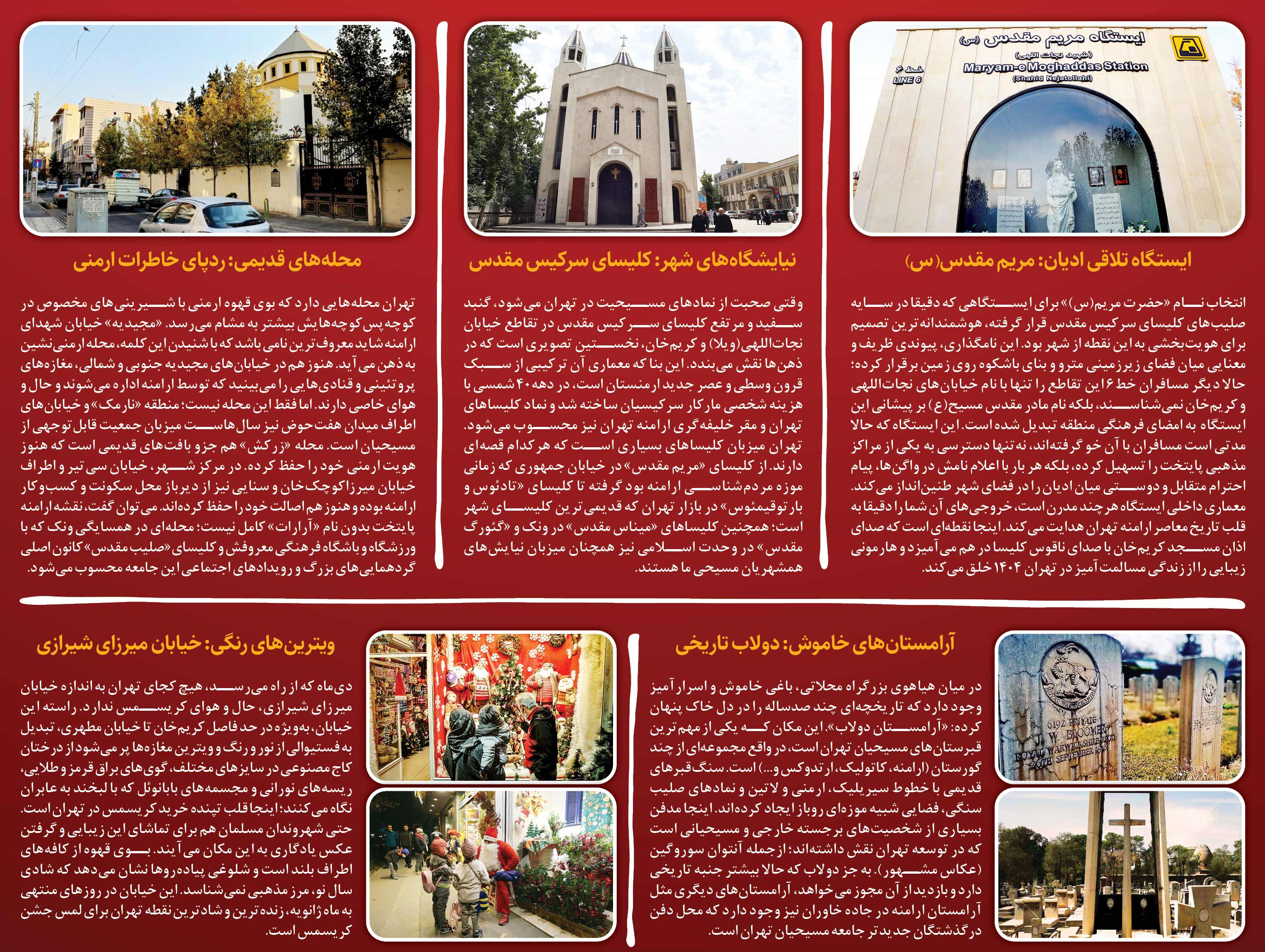 هویت شهرها را گاهی باید در تابلوهای راهنمای آن جستوجو کرد؛ آنجا که نامها فراتر از یک آدرس خشک و خالی، حامل یک پیام فرهنگی عمیق میشوند. حضور نام «حضرت مریم(س)» در نقشه متروی تهران که مدتی است مسافران با آن خو گرفتهاند، دقیقا همین کارکرد را دارد. اینجا دیگر فقط یک توقفگاه در خط۶ نیست؛ بلکه تبلور عینی دیپلماسی شهری و احترام متقابل در عمق خاک تهران است. وقتی مسافران از واگنها پیاده میشوند و چشمشان به تابلوی زرد رنگی میخورد که نام مادرحضرت مسیح(ع) را یدک میکشد، بیواسطه با مفهوم «تهران؛ شهر همه ادیان» روبهرو میشوند. این ایستگاه که درست زیر سایه صلیبهای کلیسای سرکیس مقدس قد علم کرده، جدیدترین روایت پایتخت از همزیستی مسالمتآمیز است؛ روایتی که میگوید تهران در لایههای پنهان و پیدای خود، وامدار تمام شهروندانش است. حالا که تقویم به روزهای پایانی ماه دسامبر رسیده و زنگ آغاز سال ۲۰۲۶ میلادی به صدا درآمده به بهانه همین همسایگی شیرین و زادروز پیامبر صلح میخواهیم در جغرافیای مسیحی تهران پرسه بزنیم و ببینیم کدام نقطه از پایتخت از کلیساهای تاریخی و آرامستانهای خاموش تا محلههای ارمنینشین و ویترینهای پرزرق و برق، روایتگر همزیستی مسالمتآمیز و دیرینه مسیحیان در این شهر هستند.