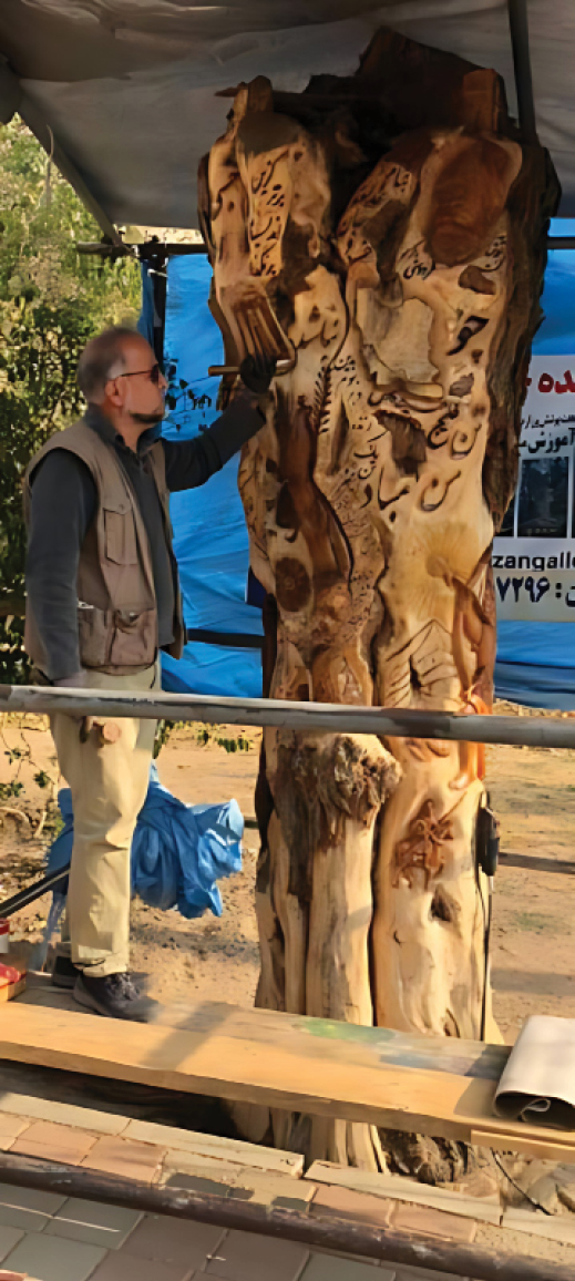در حال حاضر این هنرمند مشغول پیکرتراشی تنه خشک درختی در بوستان میعاد است. حکاکی روی این درخت ماجرای جالبی دارد. او میگوید: «در یکی از روزهای تابستان که به پارک میعاد رفته بودم، درخت خشکیدهای نظرم را جلب کرد. برخلاف دفعههای قبل که شهرداری از من درخواست همکاری میکرد، موضوع پیکرتراشی این درخت را خودم به شهرداری منطقه5 پیشنهاد دادم. آنها هم استقبال کردند. در نتیجه کار از شهریورماه شروع شد و حالا به آخرهایش رسیده است. مردم هنگام عبور از بوستان تعجب میکنند و وقتی میبینند که درخت خشکیده شکل جدیدی گرفته، کنارش میایستند و عکس یادگاری میگیرند.»
