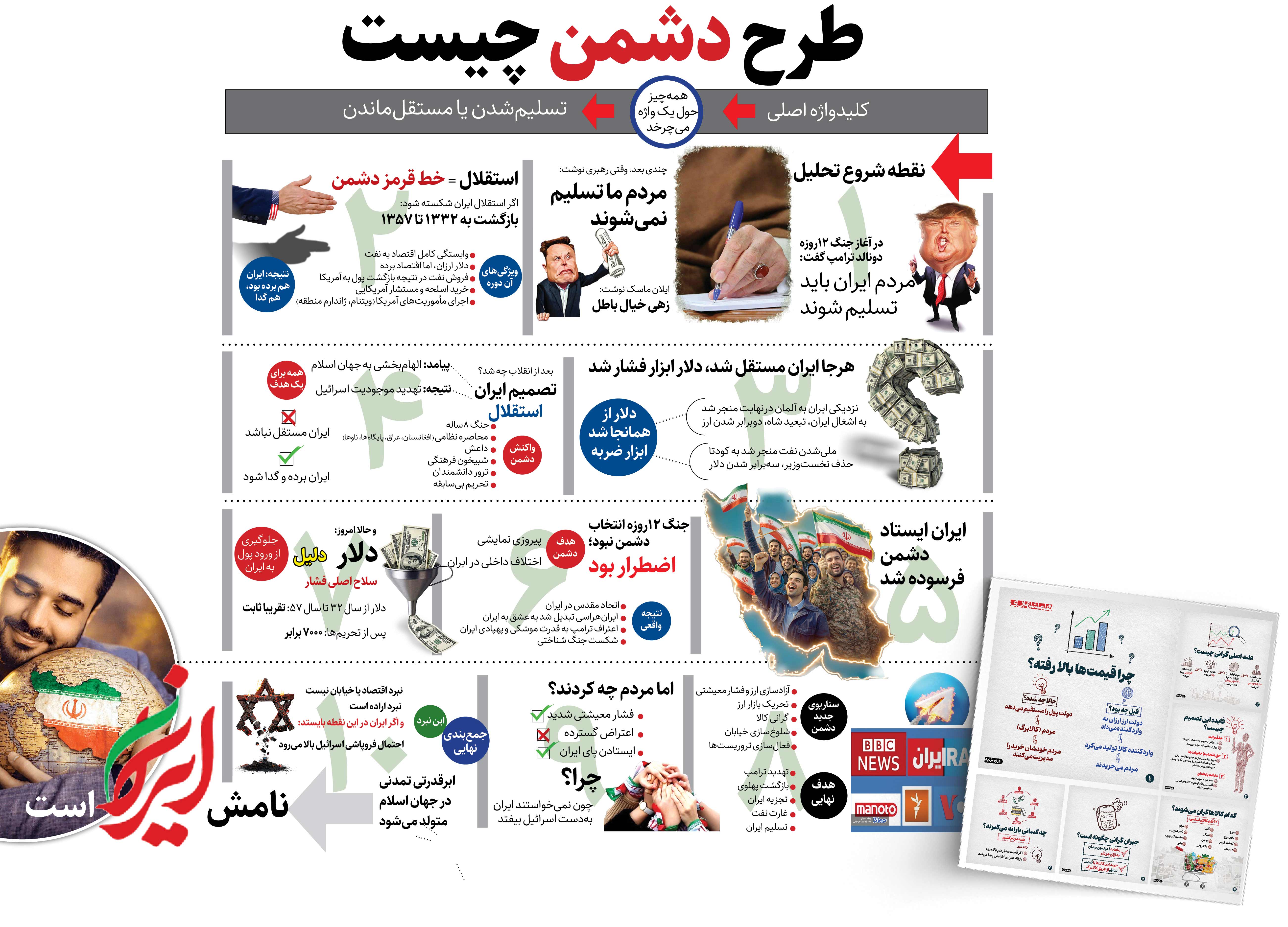 ربعپهلوی ملعون میگوید «بهزودی به ایران میآیم»، بیآنکه خندهاش بگیرد. ترامپ میگوید «نیروی کمکی میفرستم». رسانههایشان مینویسند «رهبری در حال سفر به روسیه است». آن یکی مدعی میشود «بخش بزرگی از ارتش با پهلوی بیعت کرده». در خیال خامشان، کارکرد این حرفها برای تماشاگرهاست؛ برای القای اینکه «دیگر کار تمام است» و چرا معطلید؛ اوج بلاهت.