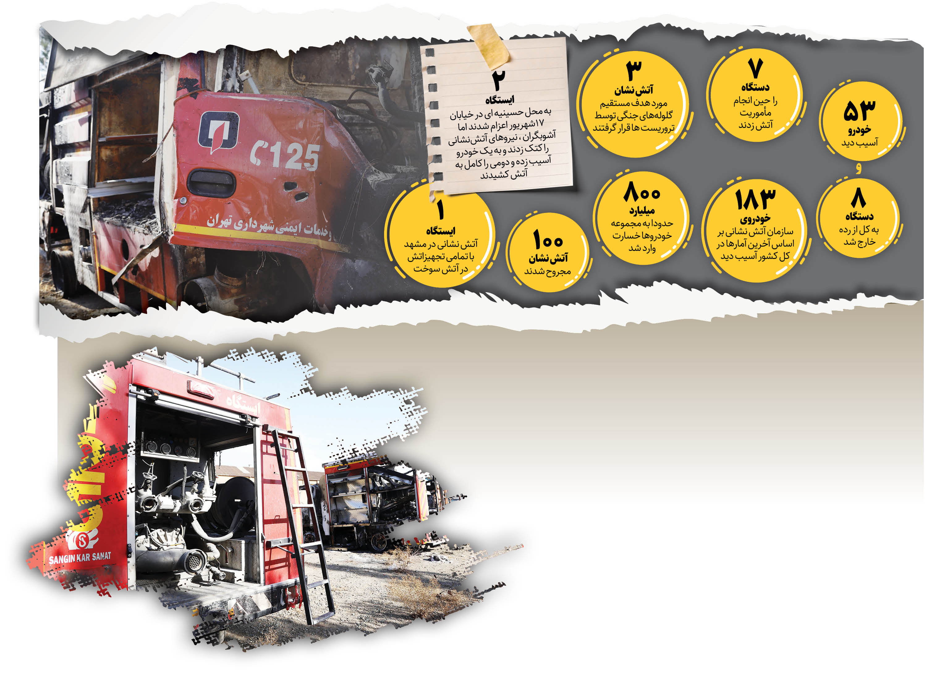 یکی از تلخ‌ترین وقایعی که در آشوب‌های اخیر رخ داد حمله به‌ خودروهای آتش‌نشانی و آتش زدن خودروهایی بود که برای نجات جان مردم و اطفای حریق به مأموریت اعزام شده بودند. بنا به اعلام سازمان آتش‌نشانی، در آشوب‌های اخیر 53خودروی آتش‌نشانی آسیب دیده و 8خودرو کامل سوخته و لاشه آنها به جاده بهشت زهرا و محدوده صالح آباد شرقی منتقل شده است. سری به گورستان ماشین‌های سوخته آتش‌نشانی زدیم و با برخی از آتش‌نشانانی که خودرویشان به آتش کشیده شد حوادث و اتفاق‌های آن شب‌ها را مرور کردیم.