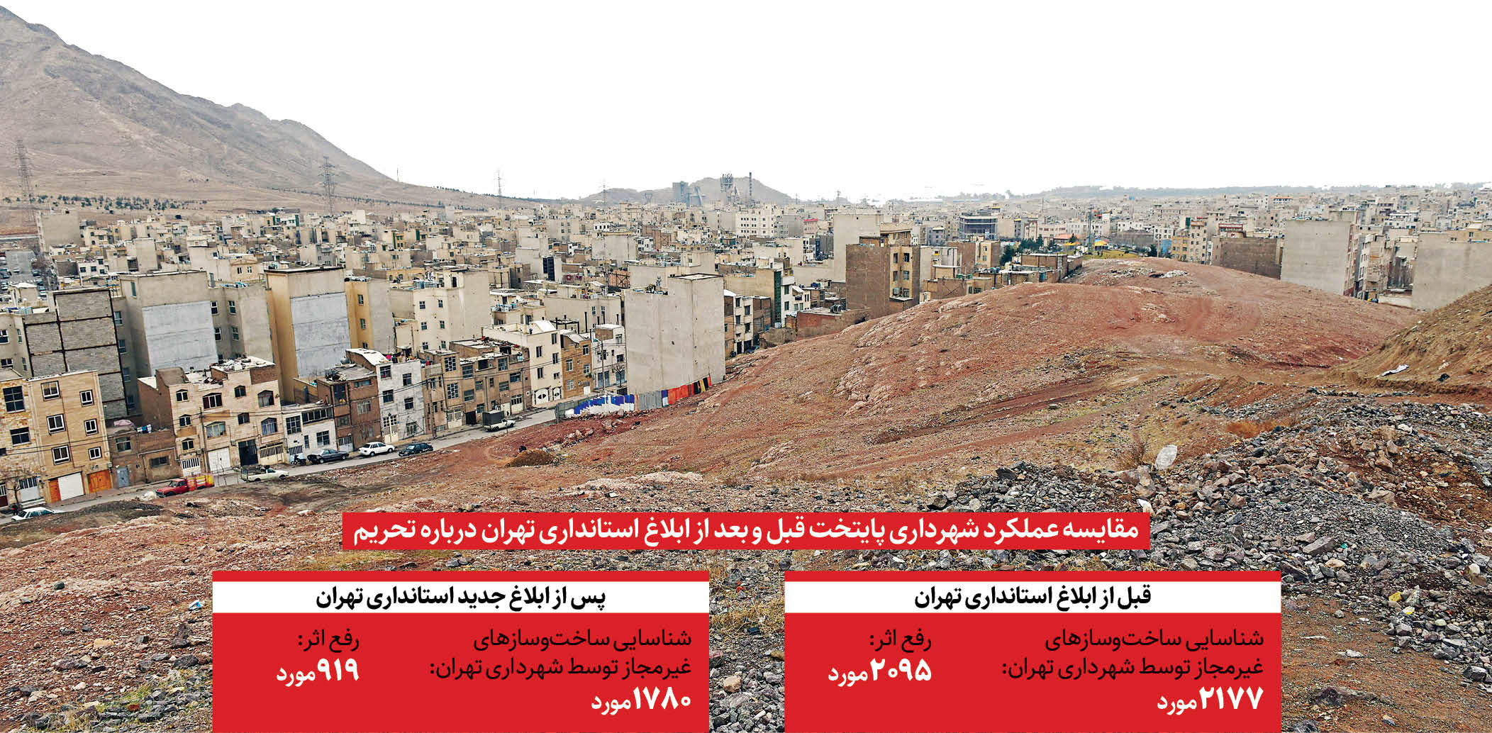 تخریب ساختوساز غیرمجاز گاهی علاوه بر اینکه خسارات مالی بهدنبال دارد ممکن است خسارات جانی هم بهدنبال داشته باشد که دردآور است. ضمن اینکه اتلاف مصالح و سرمایههای انسانی در شرایط اقتصادی فعلی بهصلاح نیست. در این مقطع نیز که با اختلافاتی بین استانداری و شهرداری در مورد حریم روبهرو هستیم، احتمالا ساختوسازها تشدید خواهد شد که نیازمند نظارت بیشتری است. در نتیجه کاهش نظارتها، در حریم منطقه۲۰ تعداد ۱۴مورد تغییر کاربری، تفکیک اراضی و ساختوساز غیرمجاز در یک هفته و همزمان با اغتشاشات گزارش شده است.
