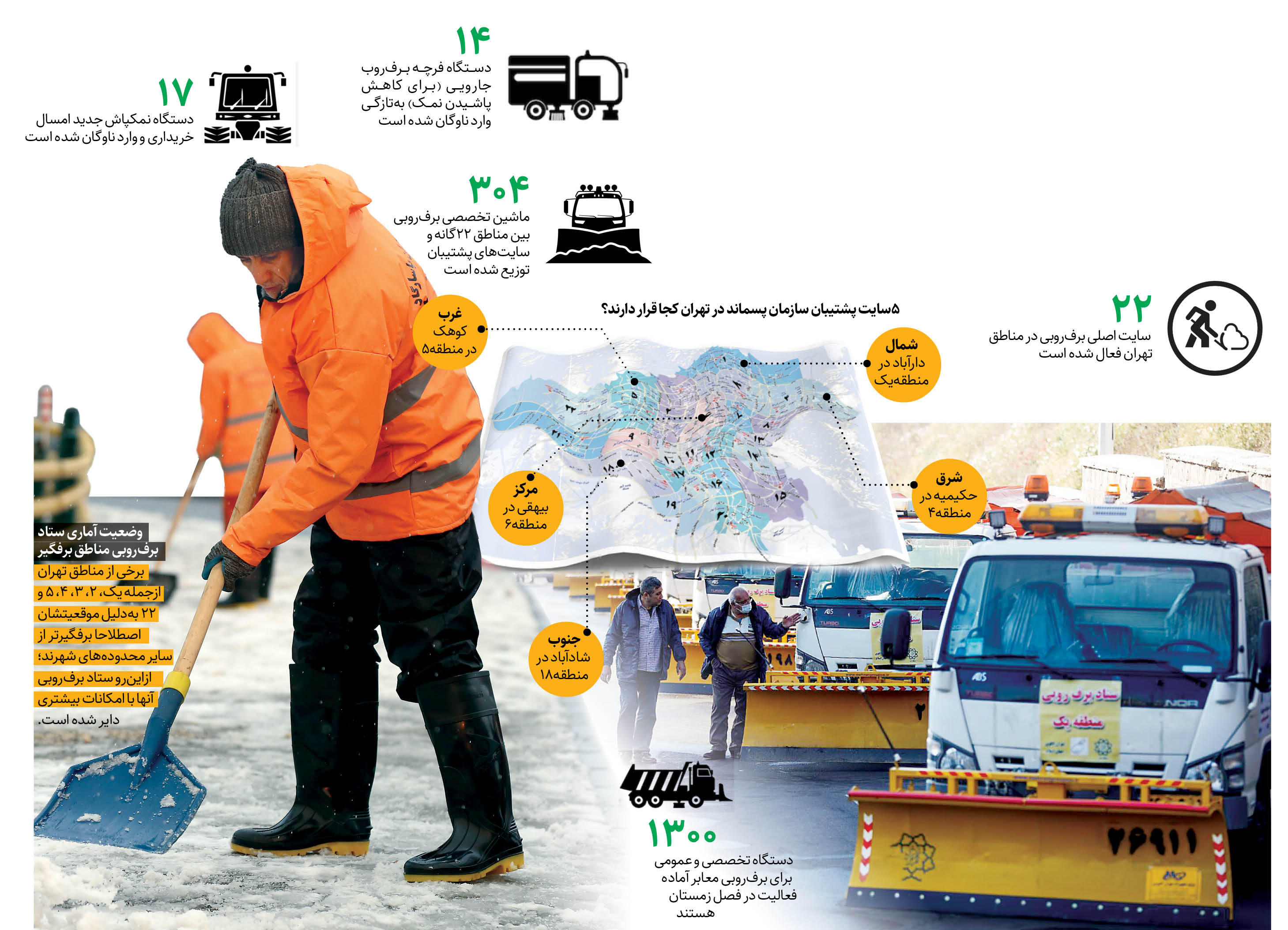حدود 10هزار نیروی خدمات شهری در پایتخت در شرایط عادی وظیفه نگهداشت شهر را برعهده دارند و در روزهای برفی با تمام توان برای برفروبی در وضعیت آمادهباش قرار میگیرند. به این تعداد چندهزار نیروی کارگری هم اضافه خواهد شد. در 22منطقه پایتخت 22سایت اصلی برفروبی فعال شده است. علاوه بر سایتهای اصلی در 124ناحیه شهرداری هم سایتهای فرعی برفروبی برپا شده است. براساس موقعیت جغرافیایی و ویژگیهای برخی مناطق، در برخی نواحی بیش از یک سایت فرعی برفروبی ایجاد شده است. بهاینترتیب تعداد سایتهای فرعی برفروبی در شهر به عدد 144 میرسد.
