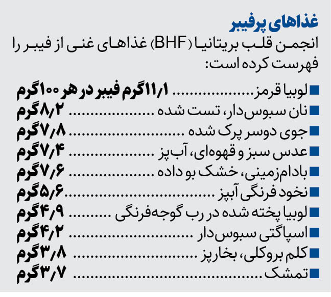 امروزه خوردن غذاهای فست فودی و پر از چربیهای ناسالم به روال عادی تبدیل شده و بسیاری از ما غافل از خوردن سبزیجات و مواد غذایی لازم برای ارتقای سلامت بدن هستیم. بهگفته کارشناسان، خوردن فیبر به میزان حداقل دوبرابر مقدار کنونی میتواند به محافظت در برابر بیماریهای قلبی و حتی سرطان کمک کند. بنیاد قلب بریتانیا (BHF) در یک بهروزرسانی هشدار داد که اکثر ما به اندازه کافی فیبر مصرف نمیکنیم. این ماده نقش حیاتی در حفظ سلامت دستگاه گوارش دارد، اما به کاهش کلسترول، مدیریت سطح قند خون و کاهش فشار خون نیز کمک میکند. خوردن فیبر بیشتر میتواند از چندین عامل بروز خطر بیماریهای قلبی عروقی جلوگیری کند. این موارد عبارتند از: