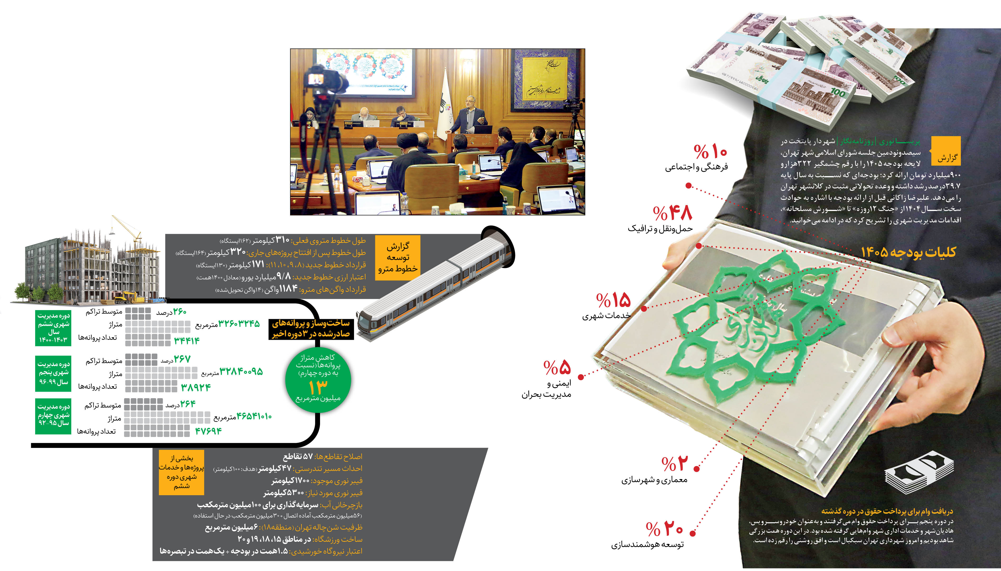 لایحه بودجه 1405شهرداری تهران: لایحه بودجه، مورد بررسی قرار گرفته و سیاست‌های آن تصویب شده است. نیمی از بودجه سال آینده نیز به بخش حمل‌ونقل اختصاص دارد و گزارش‌های مربوط به آن دریافت شده است. یکی از کارخانه‌های معروف تهران اعلام آمادگی کرده است که در خصوص ساخت اتوبوس با شهرداری همکاری خواهد کرد؛ البته ارقام پیشنهادی افزایش چشمگیری داشته و رایزنی‌ها در این زمینه برای توافق درخصوص نرخ مناسب‌تر در حال انجام است. میزان بودجه درخواستی در لایحه از سوی شهرداری بیش از 300هزار میلیارد تومان  است.