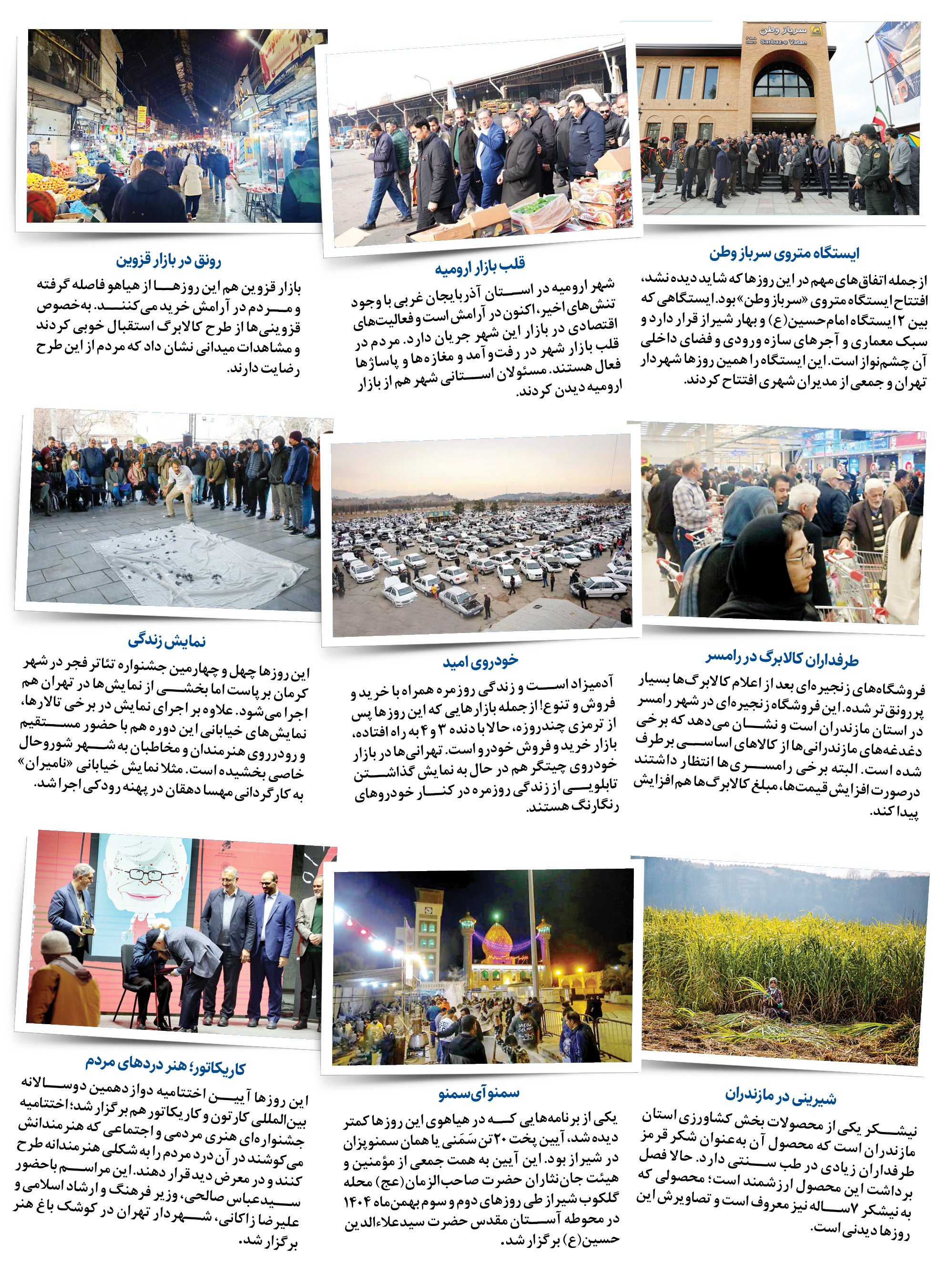 در روزهایی که ناآرامیهایی در کشورمان رخ داد و شهروندان، فشار روانی بسیاری را تحمل کردند، البته که زندگی جریان داشت. اما چون تمرکز دوربینها و رسانهها روی این ناآرامیها و استرسها بود، این قابها و اتفاقات کمتر دیده شدند. حالا که وضعیت آرامتر شده است، ما هم بد ندیدیم که مجموعهای از این قابهای کمتر دیده شده را یکجا گرد هم آوریم تا نشان بدهیم که بله، حتی در چنین وضعیتی هم زندگی جریان داشت و با قدرت به پیش میرفت و اساسا هرجایی که شور زندگی بیشتر باشد، میل به تغییر و اصلاح نیزبا حوصله بیشتری دنبال خواهد شد. در کنار این قابها، البته برف هنوز هم در کشورمان میبارد و صحنههای جالبی را هم ایجاد کرده است؛ از حافظیه برفی گرفته تا دریچههای چشمنواز دیگر در روستاها و جادهها و کوهستانها. پس این شما و این هم دریچهای به نبض آرام زندگی...