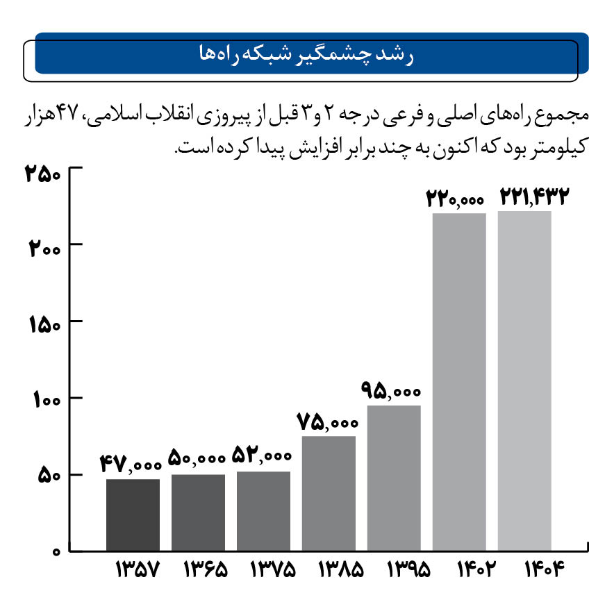 مجموع راههای اصلی و فرعی درجه 2 و3 قبل از پیروزی انقلاب اسلامی، ۴۷هزار کیلومتر بود که اکنون به چند برابر افزایش پیدا کرده است.