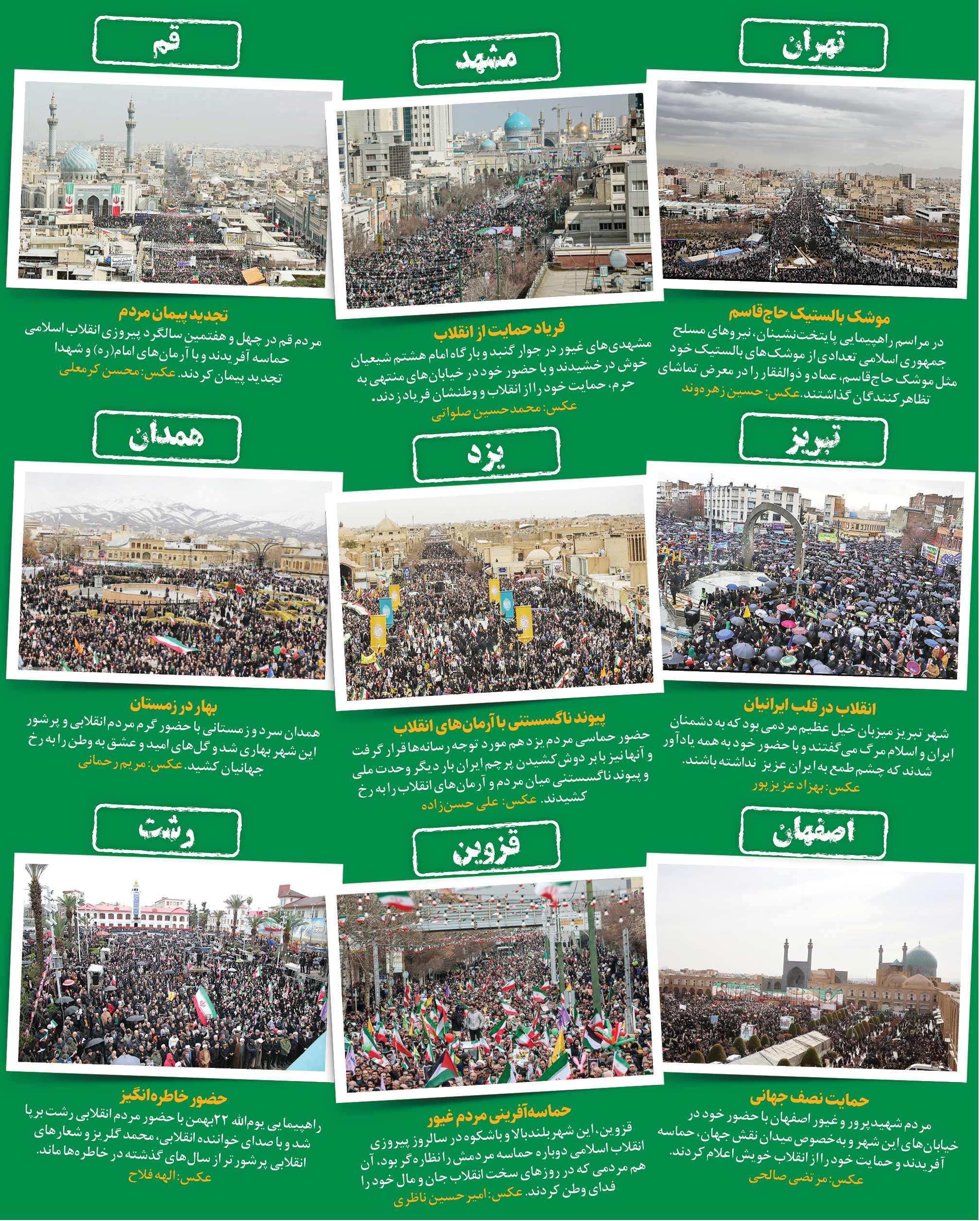 مردم تهران و شهرهای دیگر ایران، طبق قرار قبلی، در نقاط قبلی و با همان شدت و ایمان قبلی جمع آمدند تا جشن پیروزی انقلاب اسلامی در سالگشت 47نیز برگزار شود؛ طوری که حتی رسانه‌های خارجی چون آسوشیتدپرس، بنویسند که ایرانی‌ها با وجود فشارها و تهدیدات آمریکا، به میدان آمدند و مراسم سالروز پیروزی انقلاب‌شان را برگزار کردند. مراسم 22بهمن امسال در تهران و نقاط دیگر کشور‌ در شرایط خاصی برگزار شد. تهدیدهای ضمنی دال بر اینکه حملاتی از سوی دشمن در این روزها انجام خواهد شد‌ به گوش می‌رسید. شایعات مربوط به حملات تروریستی هم که به گوش می‌رسید. اینها در حالی اتفاق می‌افتاد که بعضی از کاربران شبکه‌های مجازی نیز هفته‌ها قبل گفته بودند جمهوری اسلامی بیست‌ودوم بهمن امسال را به چشم نخواهد دید. اما بیست‌ودوم بهمن امسال از راه رسید، مراسم جشن پیروزی برگزار شد و بیگانگان دیدند که این ملت، با تهدید میانه‌ای ندارند و هرچه بیشتر تهدیدشان کنند، مصمم‌تر خواهند شد. برای اینکه با این حماسه ملی بیشتر آشنا شوید، گزارش تصویری زیر را دنبال کنید که موج جمعیت در تهران و شهرهای مختلف را نشان می‌دهد؛ تصاویر مردمی که چه در دهه 60 و توسط صدام تهدید شدند که موشک خواهند خورد و چه در دهه‌های بعد توسط تروریست‌ها تهدید شوند و چه در این روزها توسط بیگانگان، در میدان خواهند بود و با ترس میانه‌ای نخواهند داشت.
